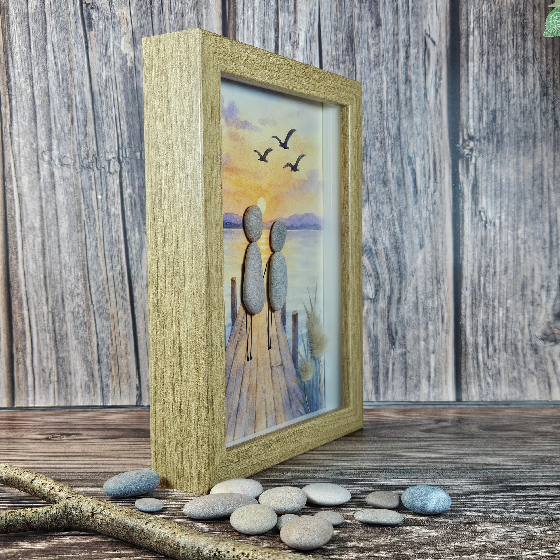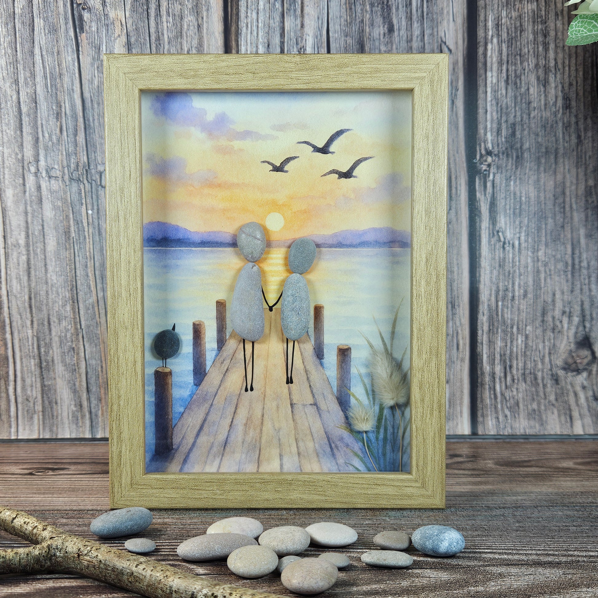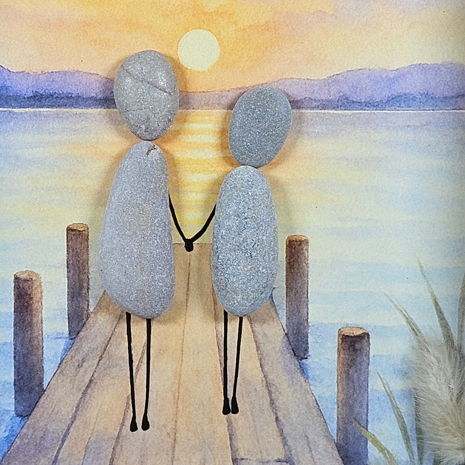 Deux galets enlacés, main dans la main, avancent sur un ponton de bois face au soleil couchant.