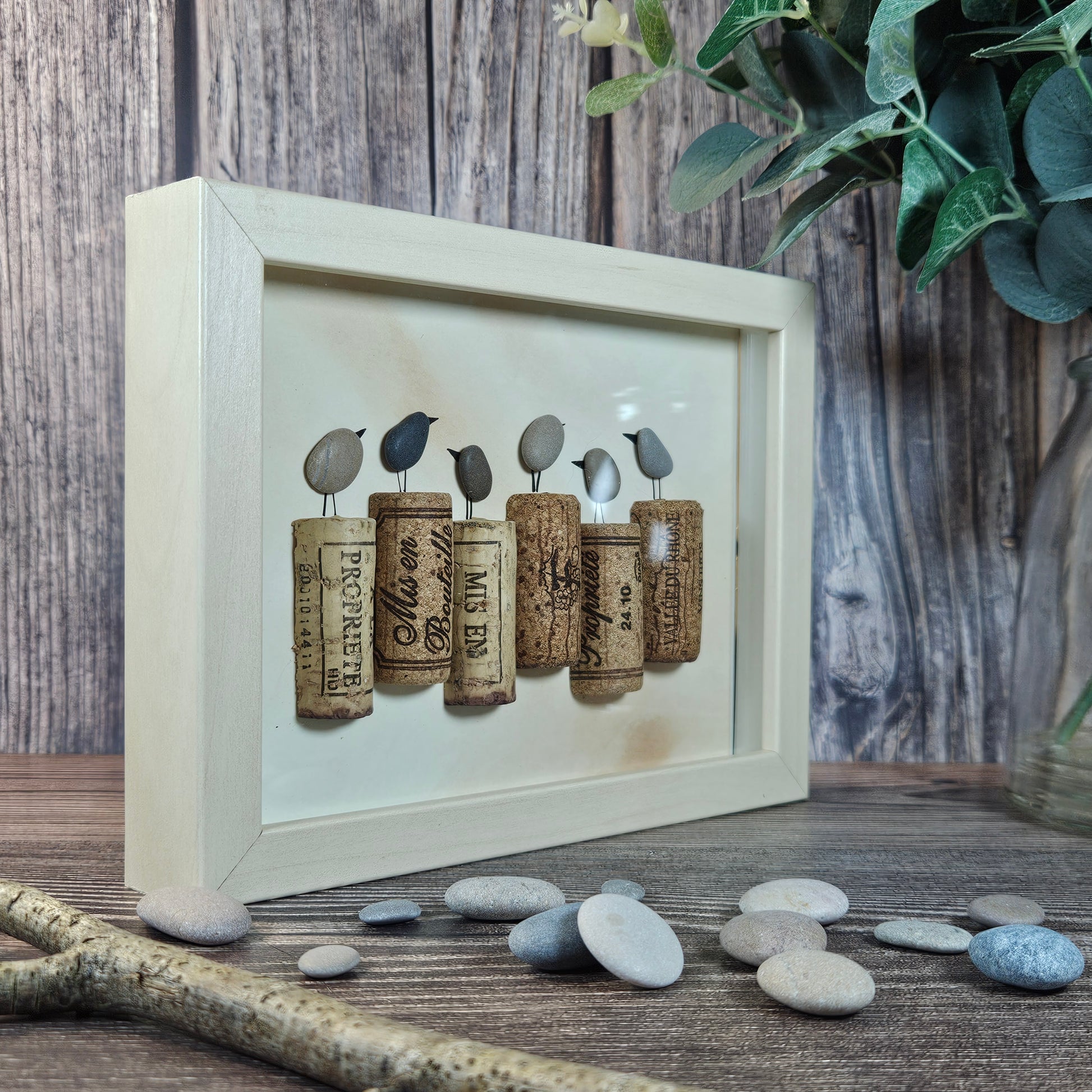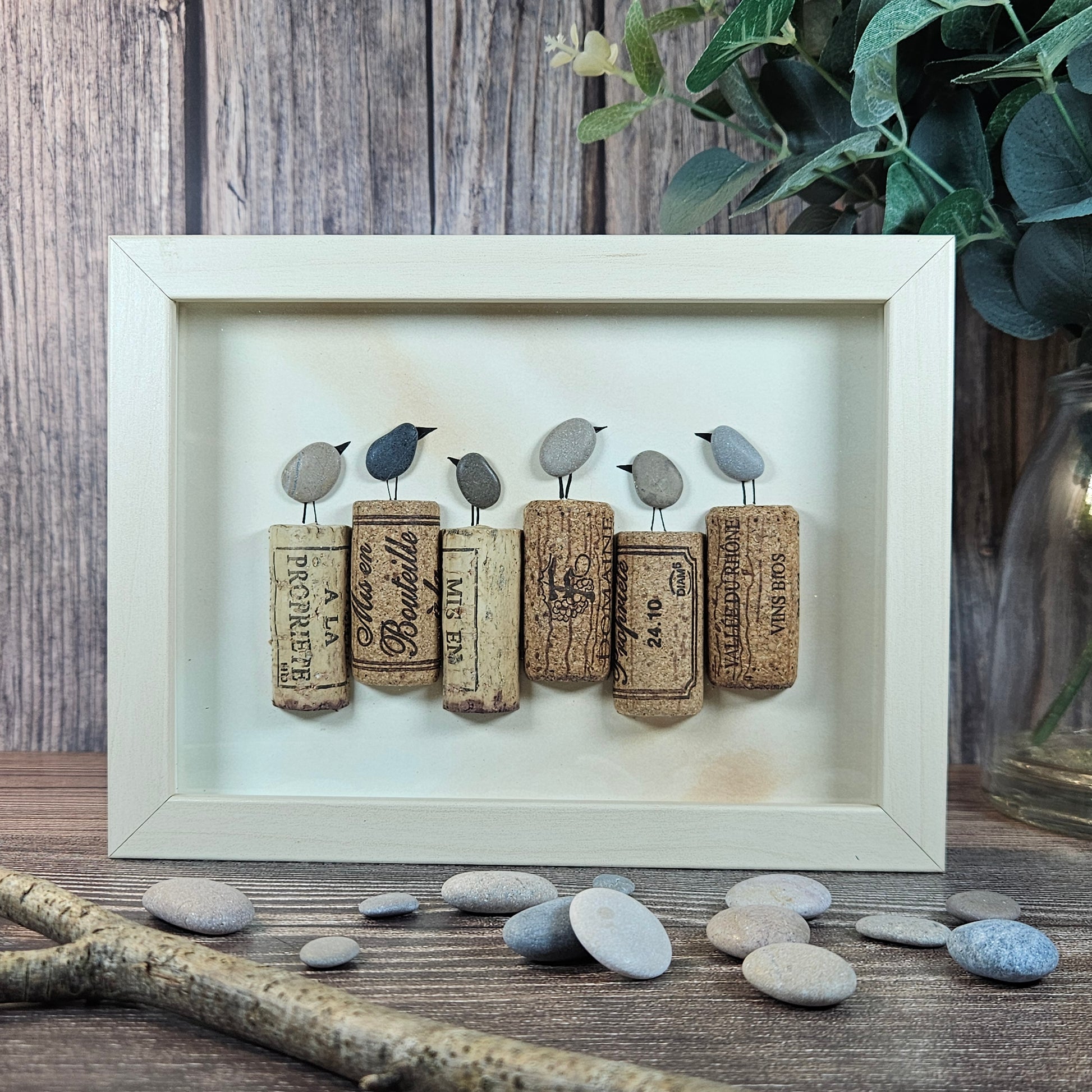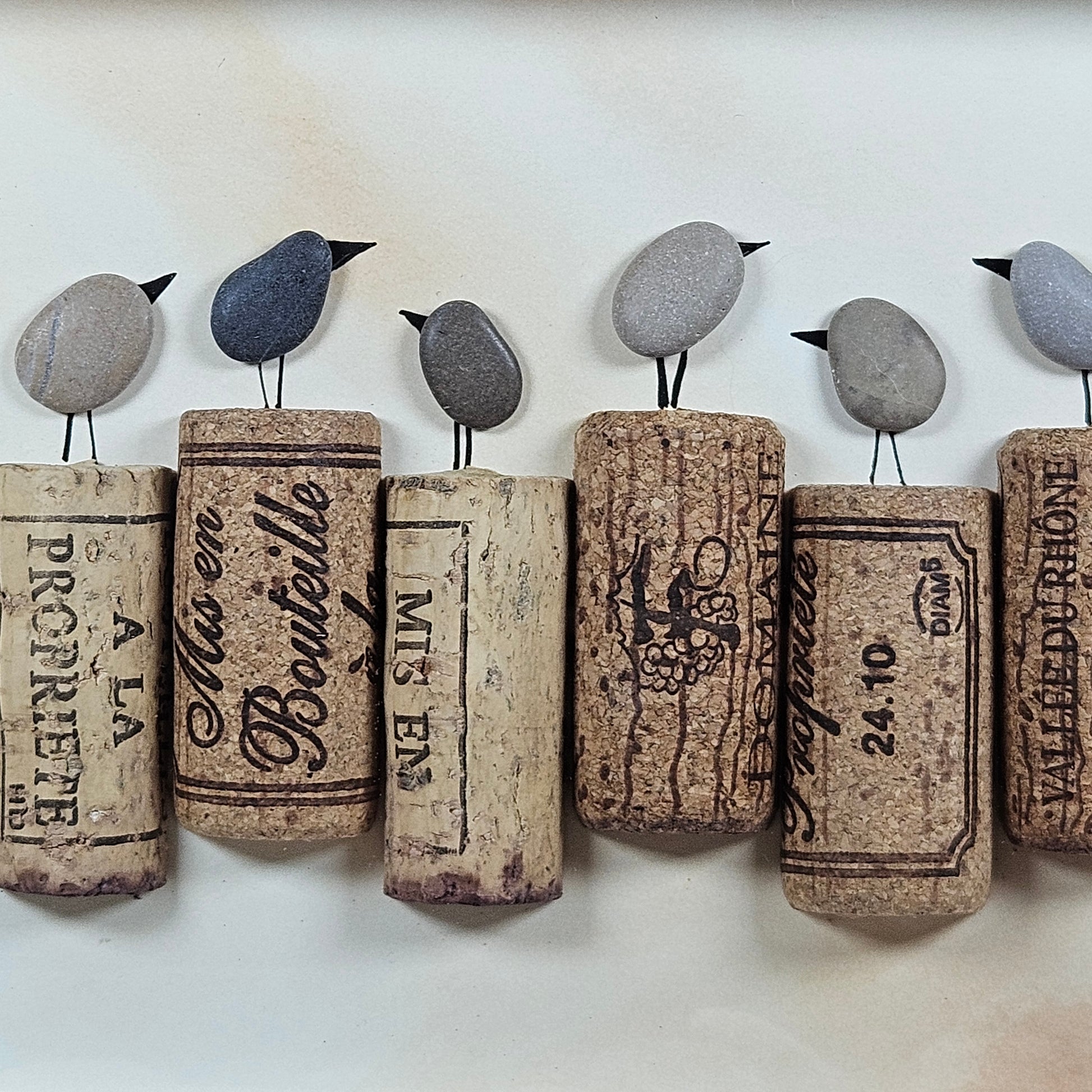 🍷 Une ribambelle de bouchons de liège se transforme en joyeux personnages, chacun orné de petits galets expressifs.