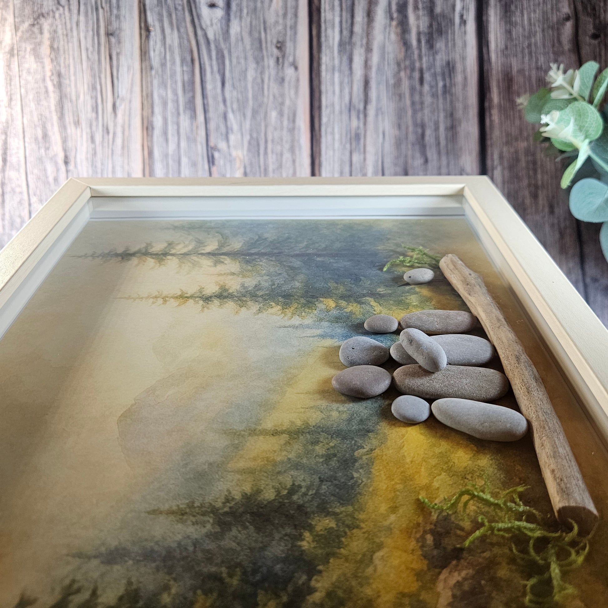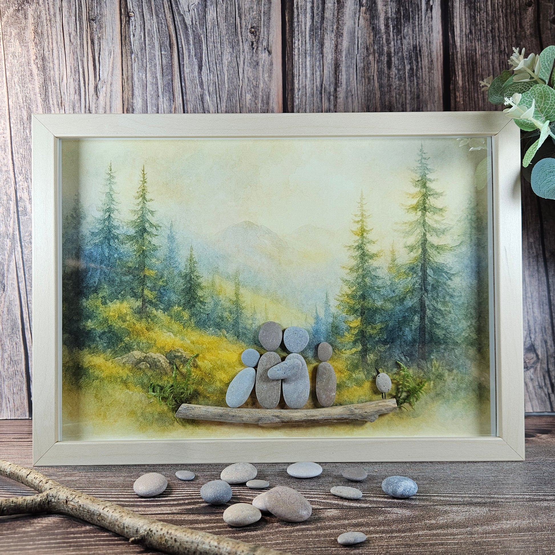 Au cœur d’un paysage de montagnes embrumées et de sapins majestueux, un couple en galets s’assoit côte à côte avec leur enfant. Ils contemplent l’horizon, unis dans la sérénité et la beauté de la nature. Ce tableau respire l’amour, la complicité et l’évasion, comme une promesse d’aventures partagées. Le fond est imprimé sur un papier qualitatif de 180g.🏞️💚