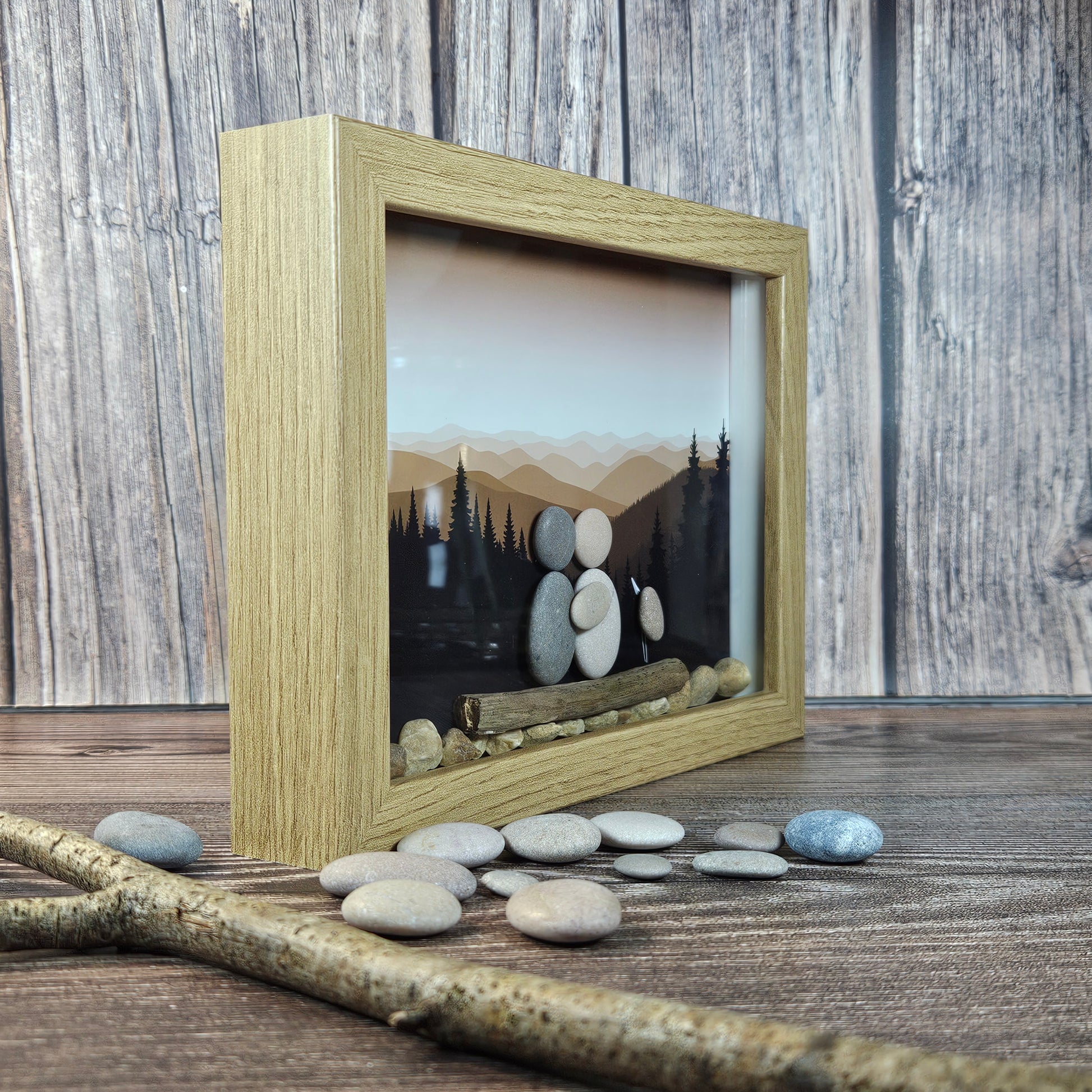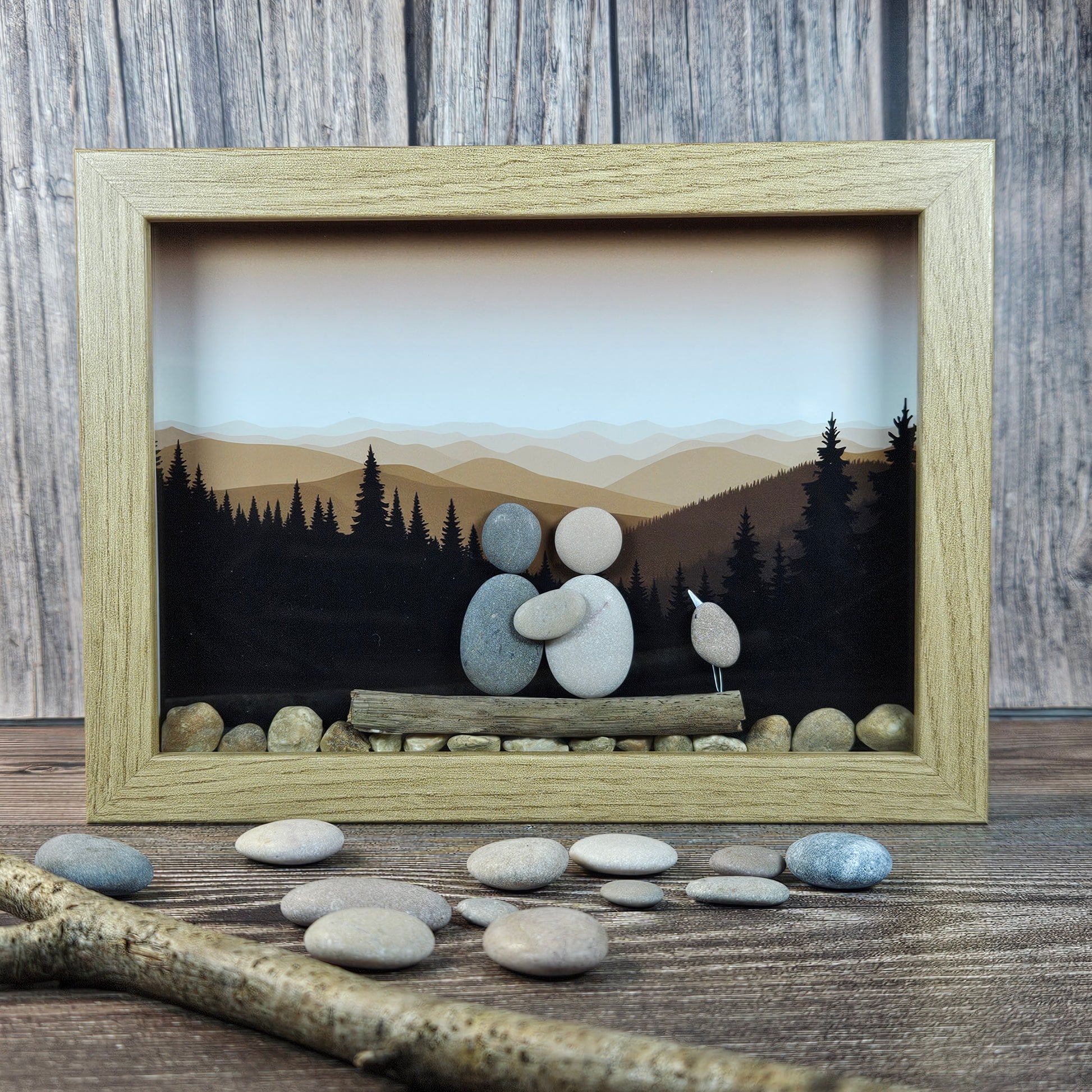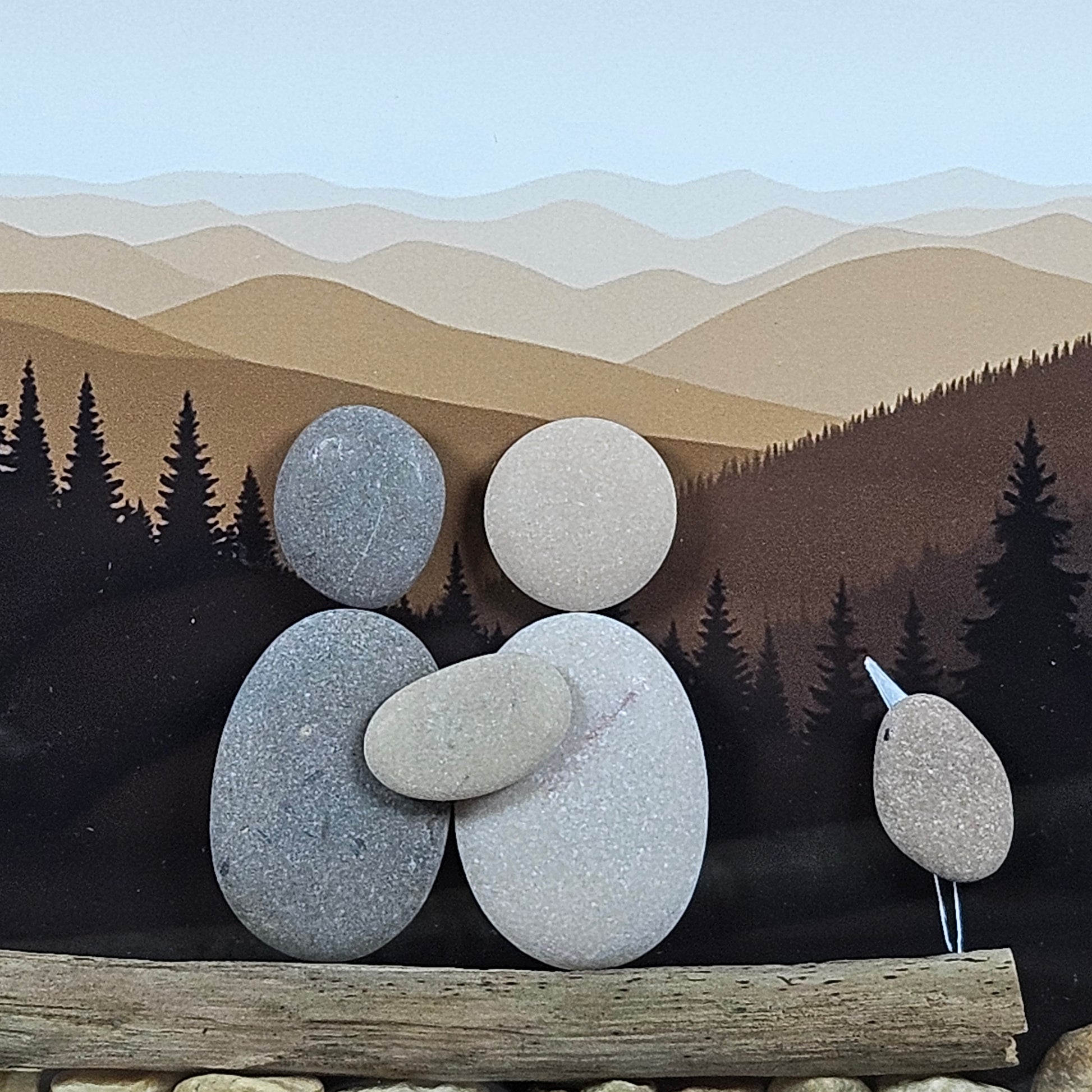 Deux galets enlacĂ©s, accompagnĂ©s dâun petit oiseau, contemplent ensemble les reliefs orangĂ©s des montagnes au crĂ©puscule.