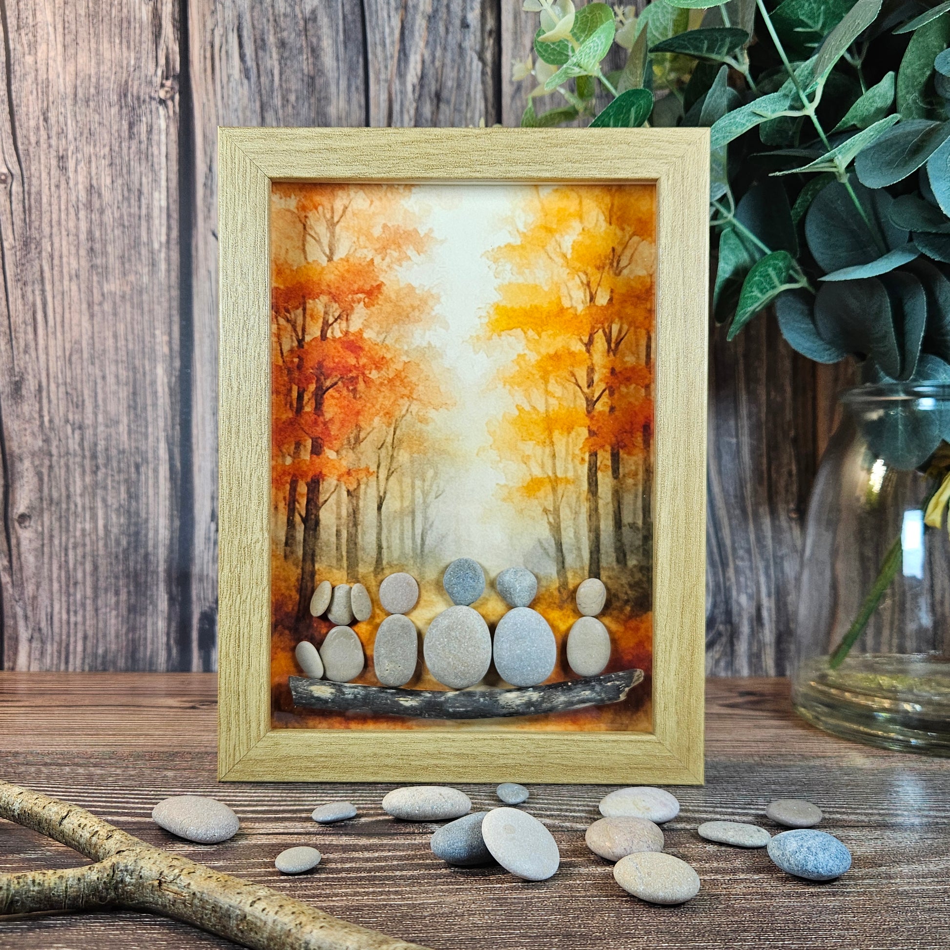 🍂 Une famille de galets se tient réunie sous les feuillages flamboyants d’une forêt d’automne.
