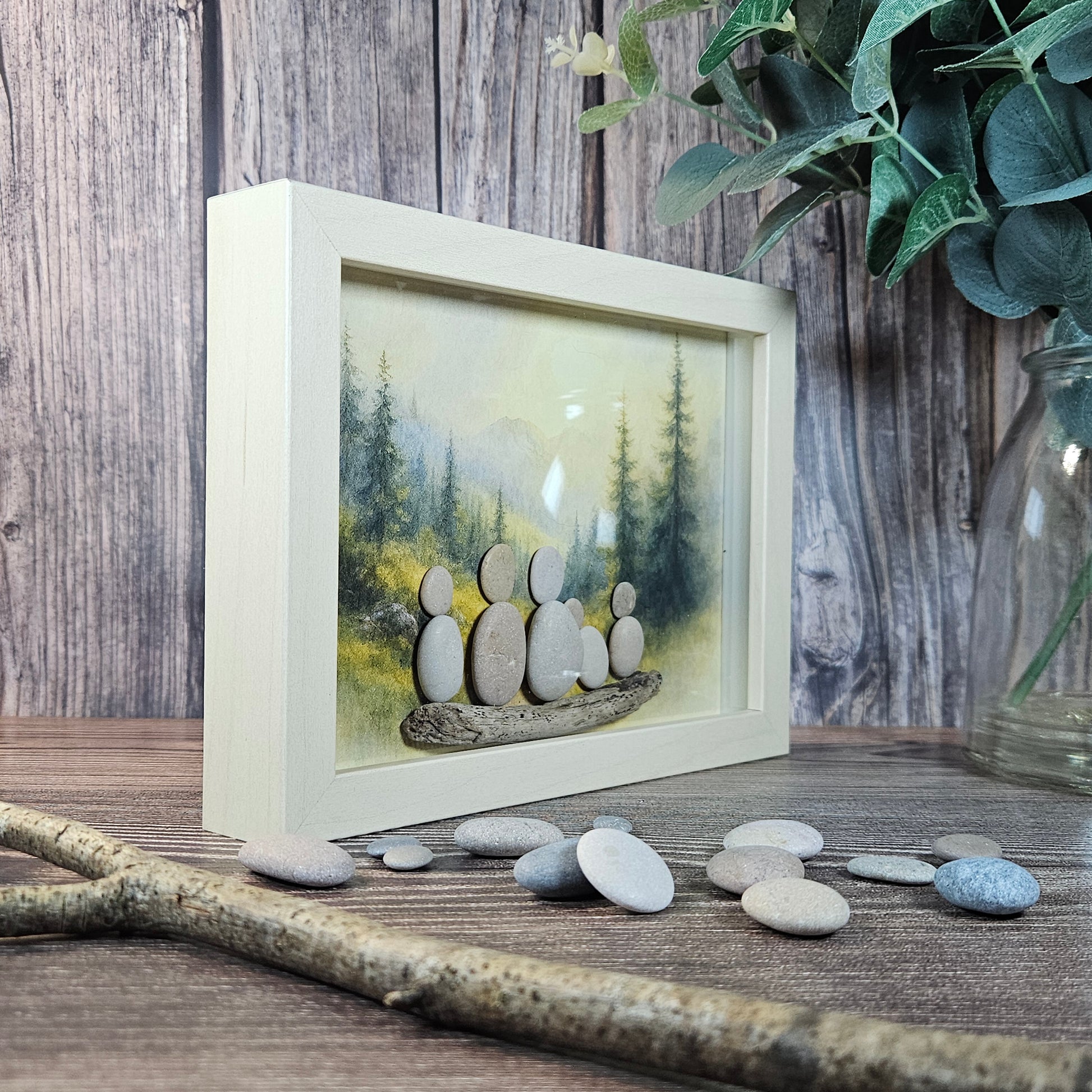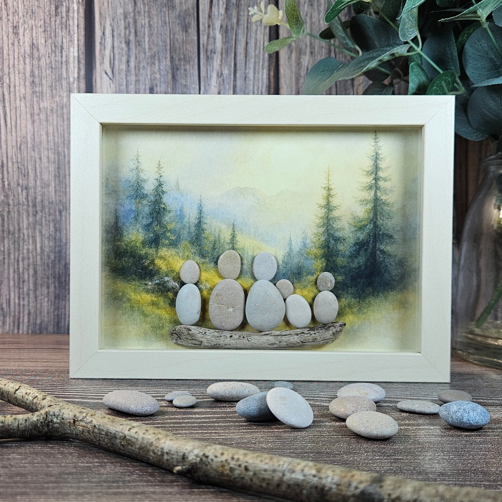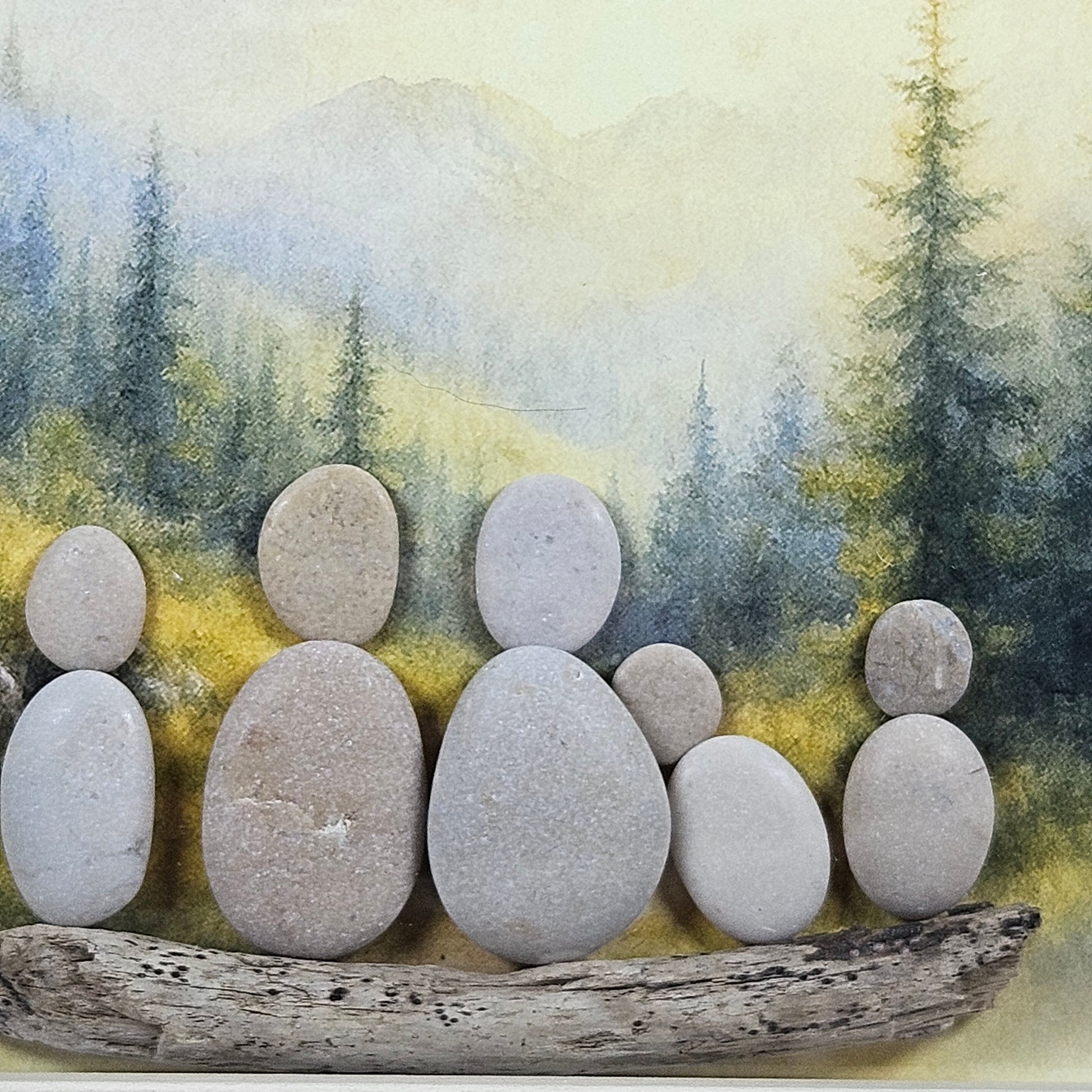 🌲 Une famille de galets se tient rassemblée dans une clairière apaisante, entourée de majestueux sapins.