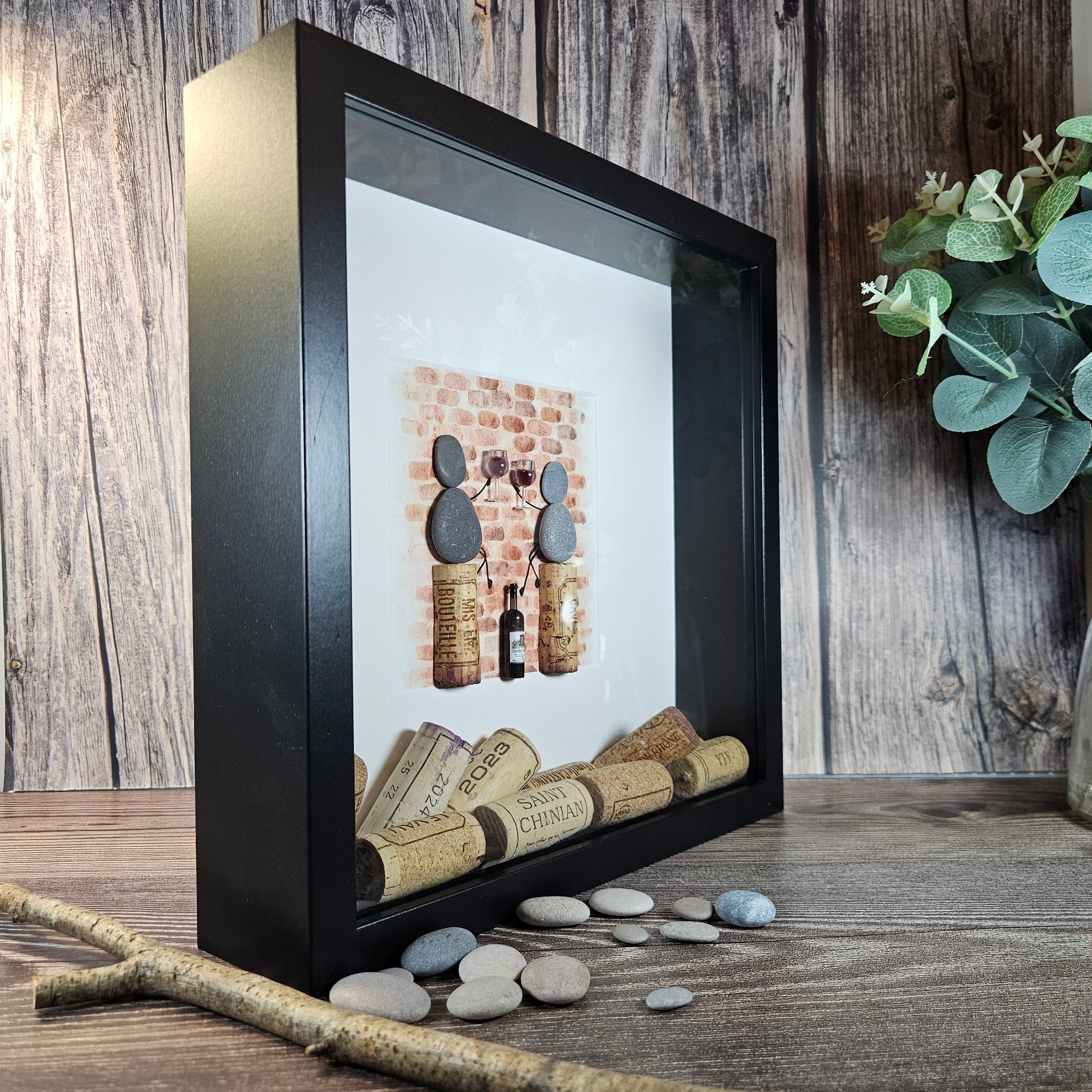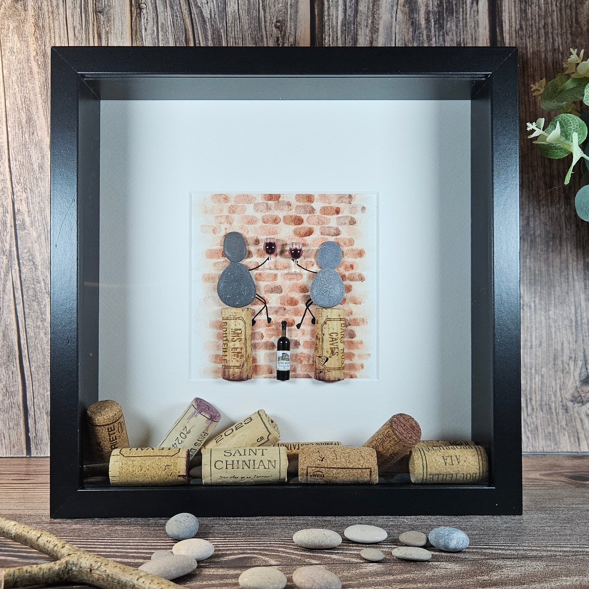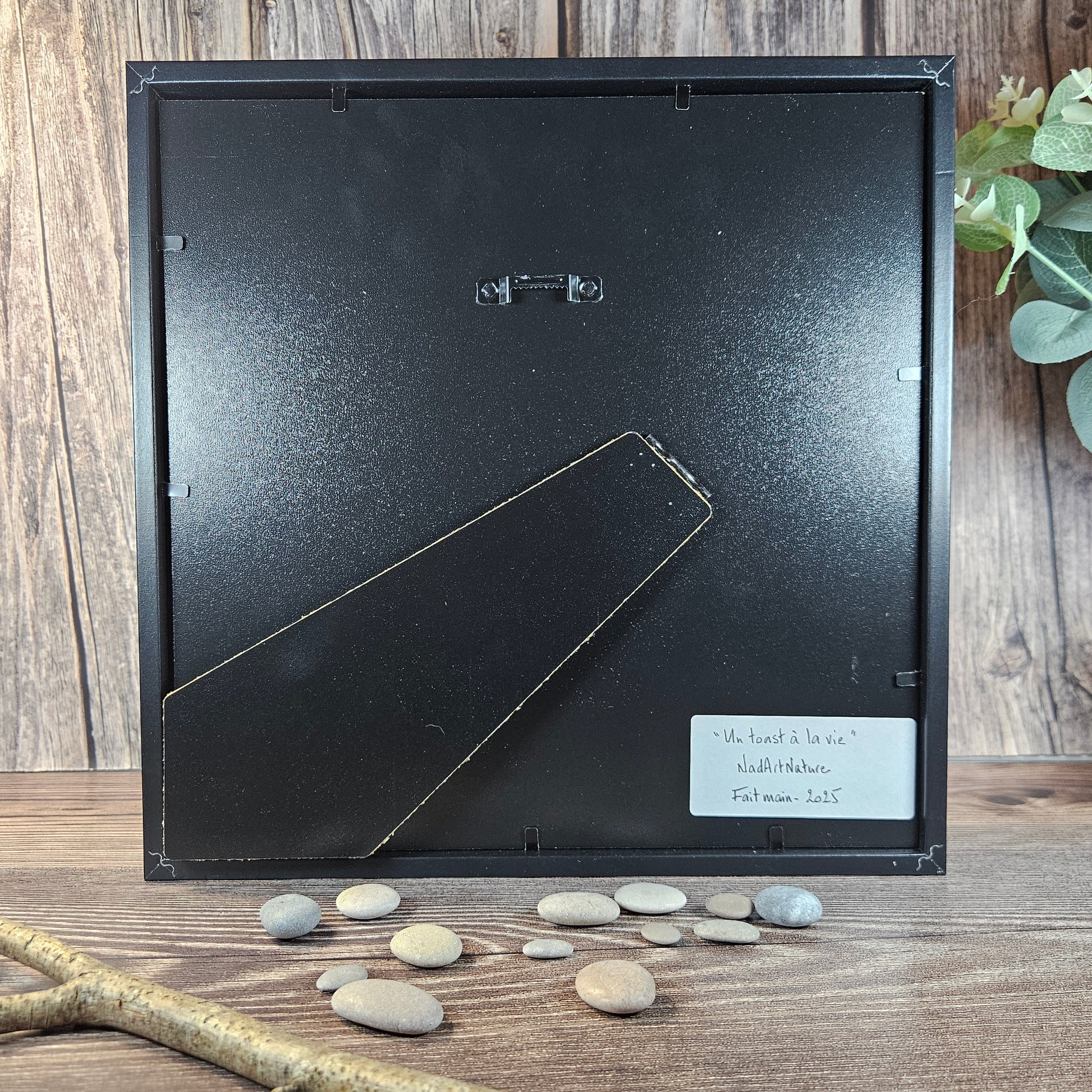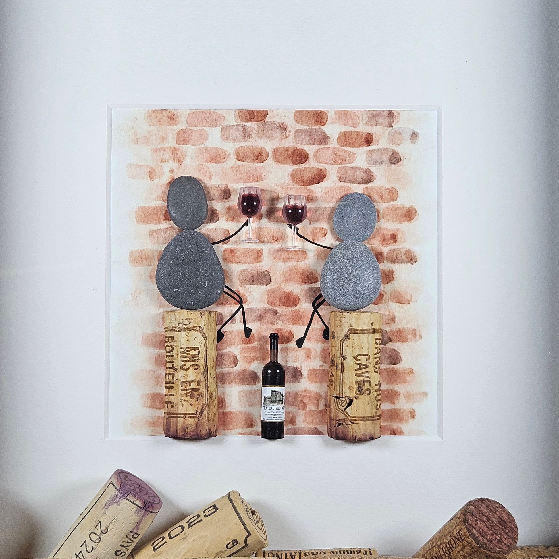 Dans ce cadre vitrine profond, deux personnages en galets trinquent joyeusement, entourés de bouchons de liège qui habillent le fond et créent un relief unique. Une scène conviviale qui respire la complicité, l’amitié et le plaisir des bons moments partagés autour d’un verre. Le fond est imprimé sur un papier qualitatif de 180g.