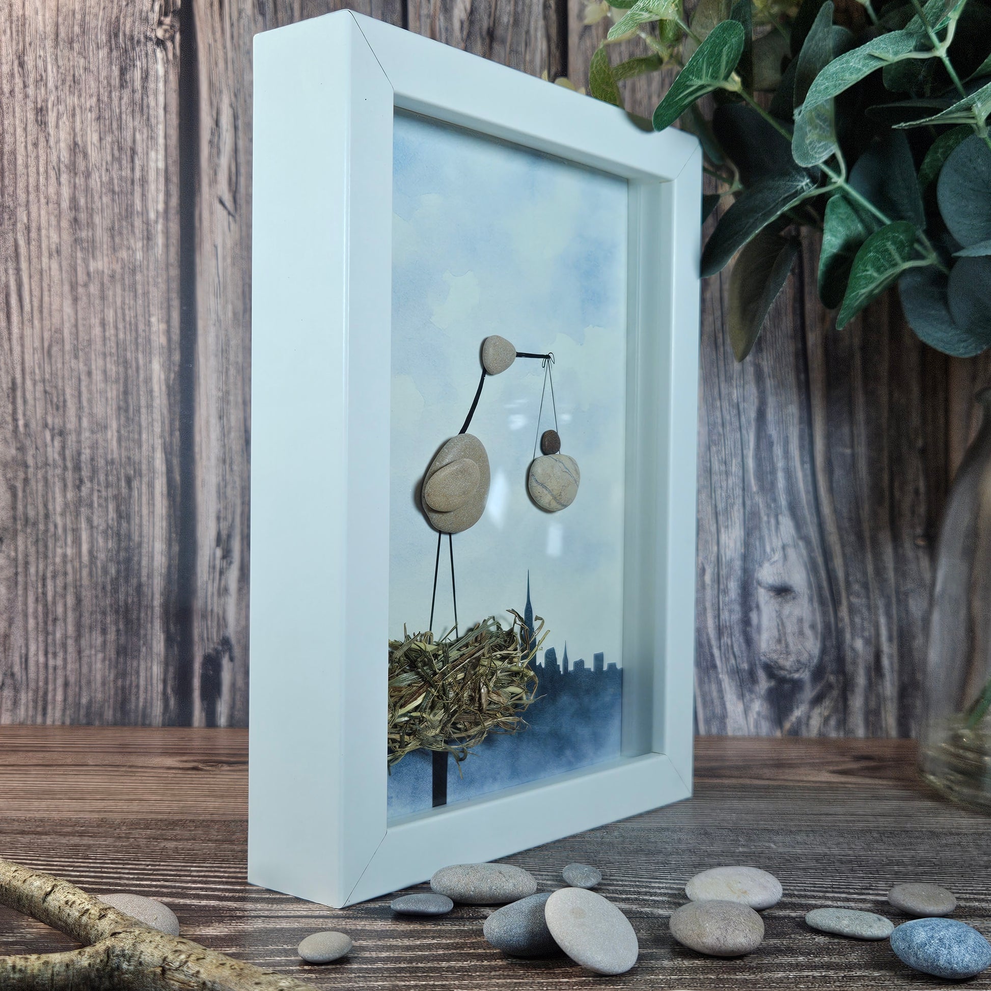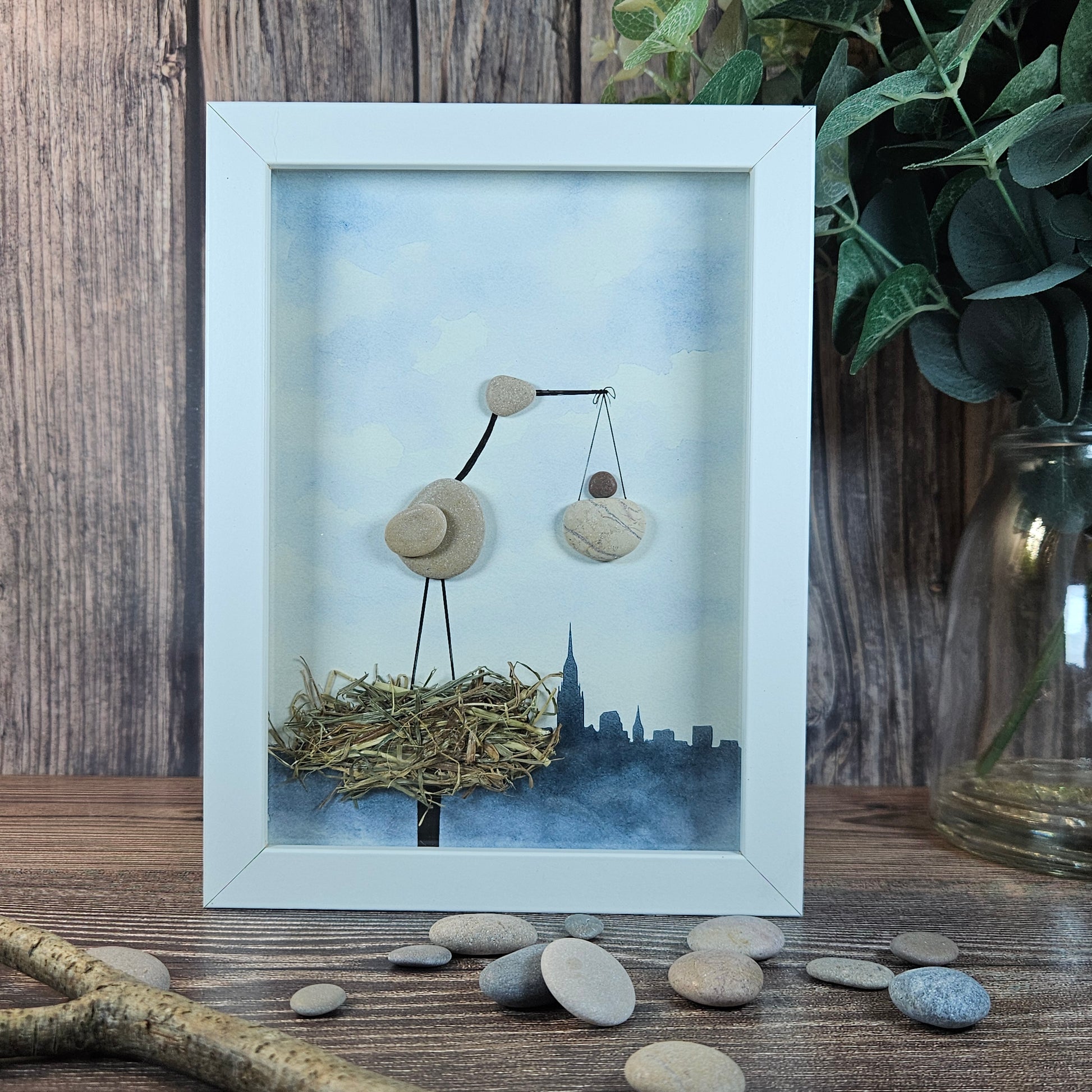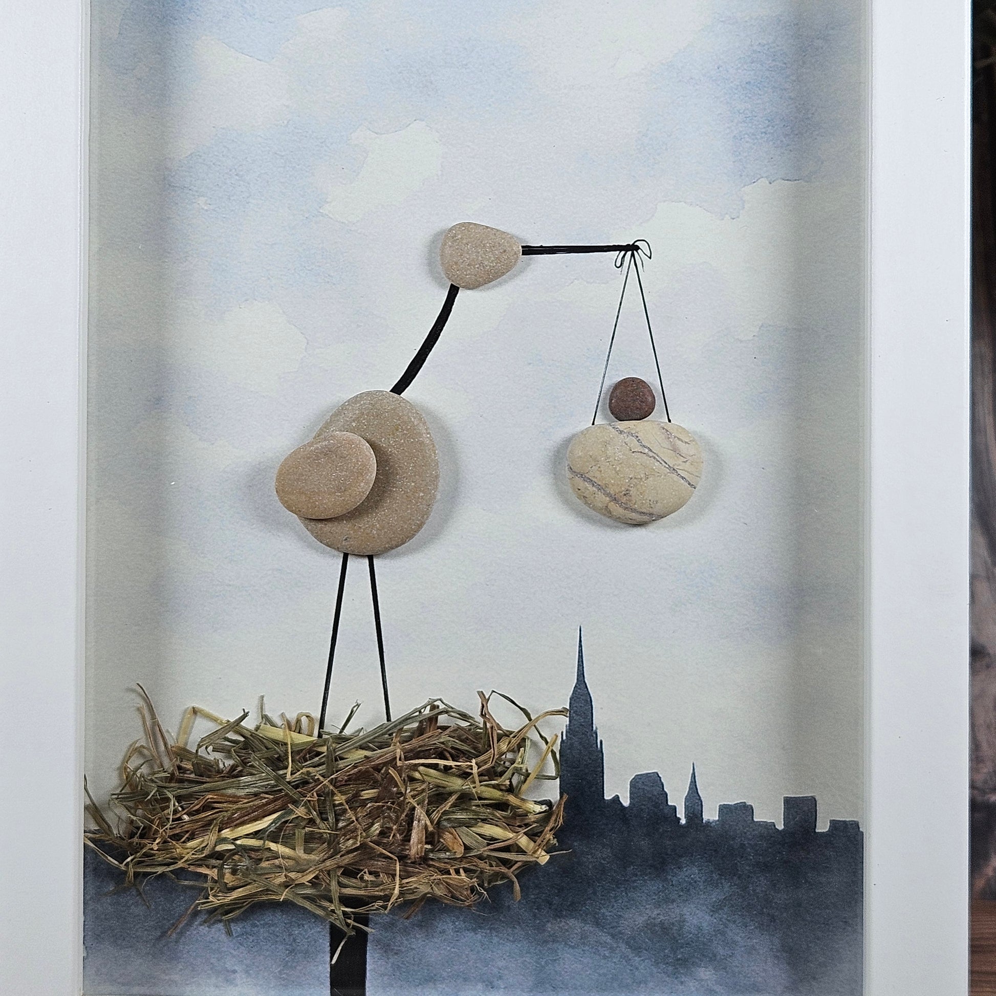 🕊️ Une élégante cigogne en galets vole dans un ciel tendre, portant avec délicatesse un panier contenant un bébé.