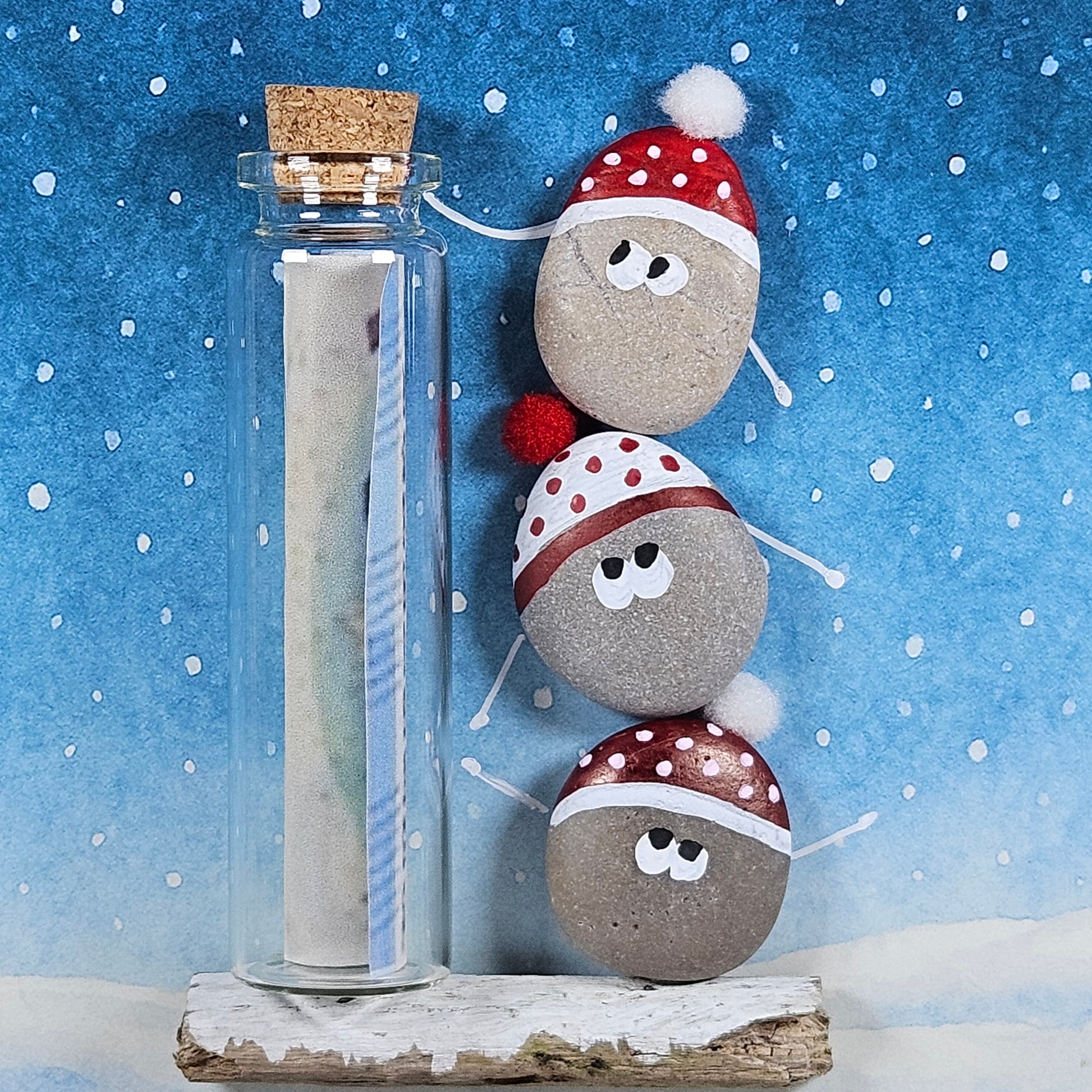 Trois petits galets coiffés de bonnets rouges s’empilent joyeusement sous un ciel d’hiver étoilé ❄️