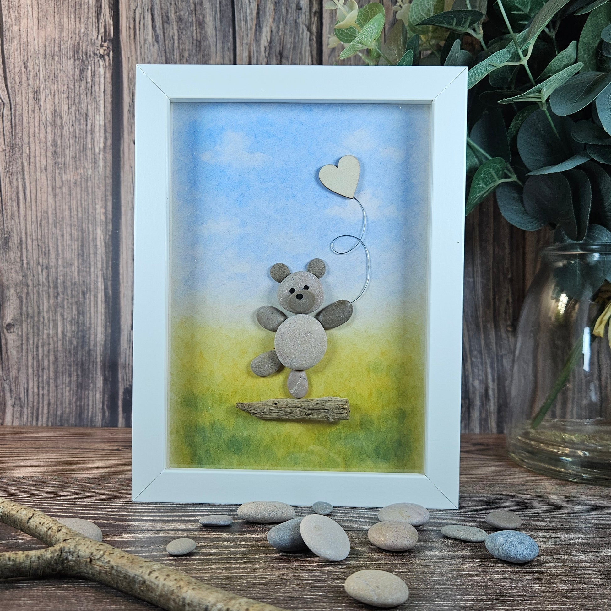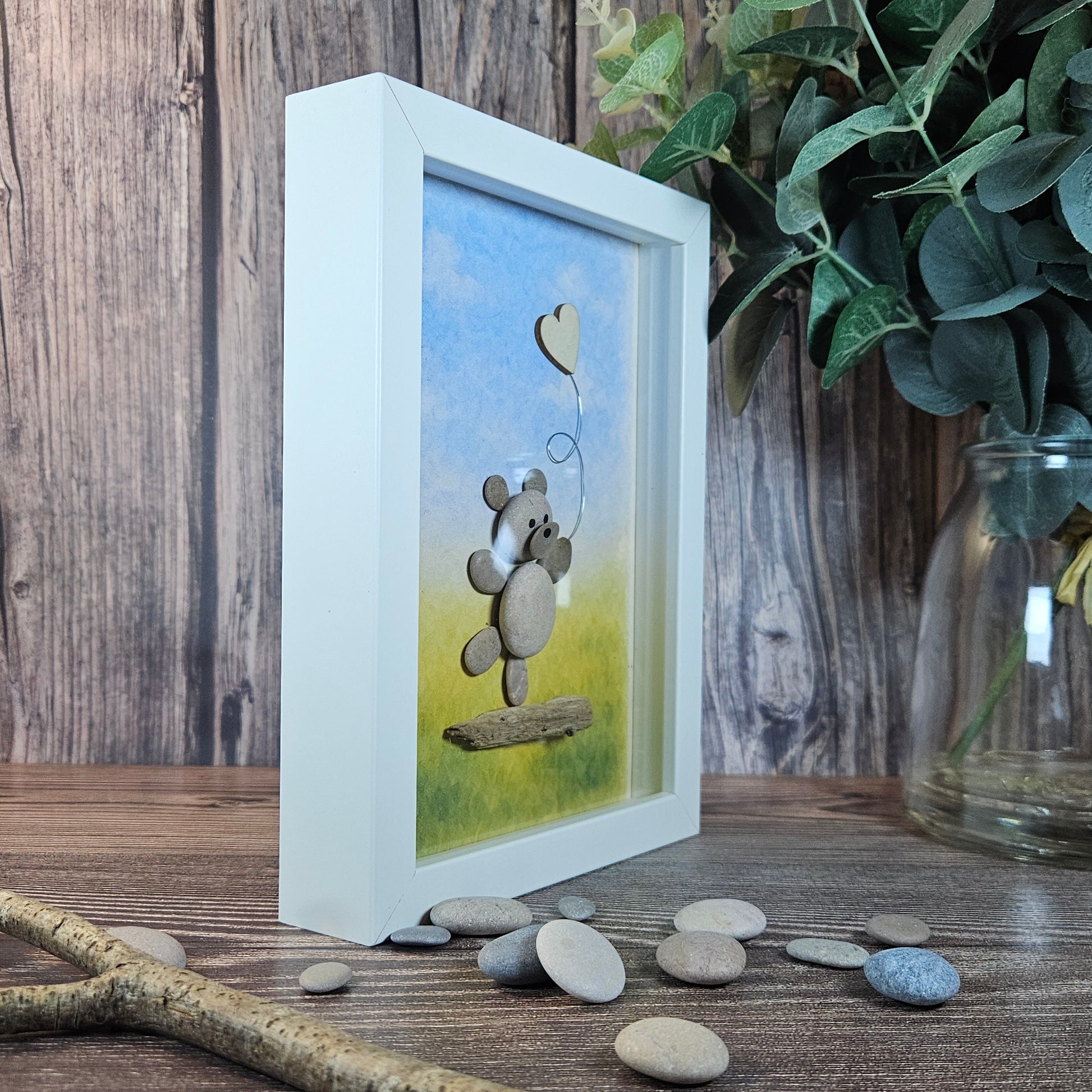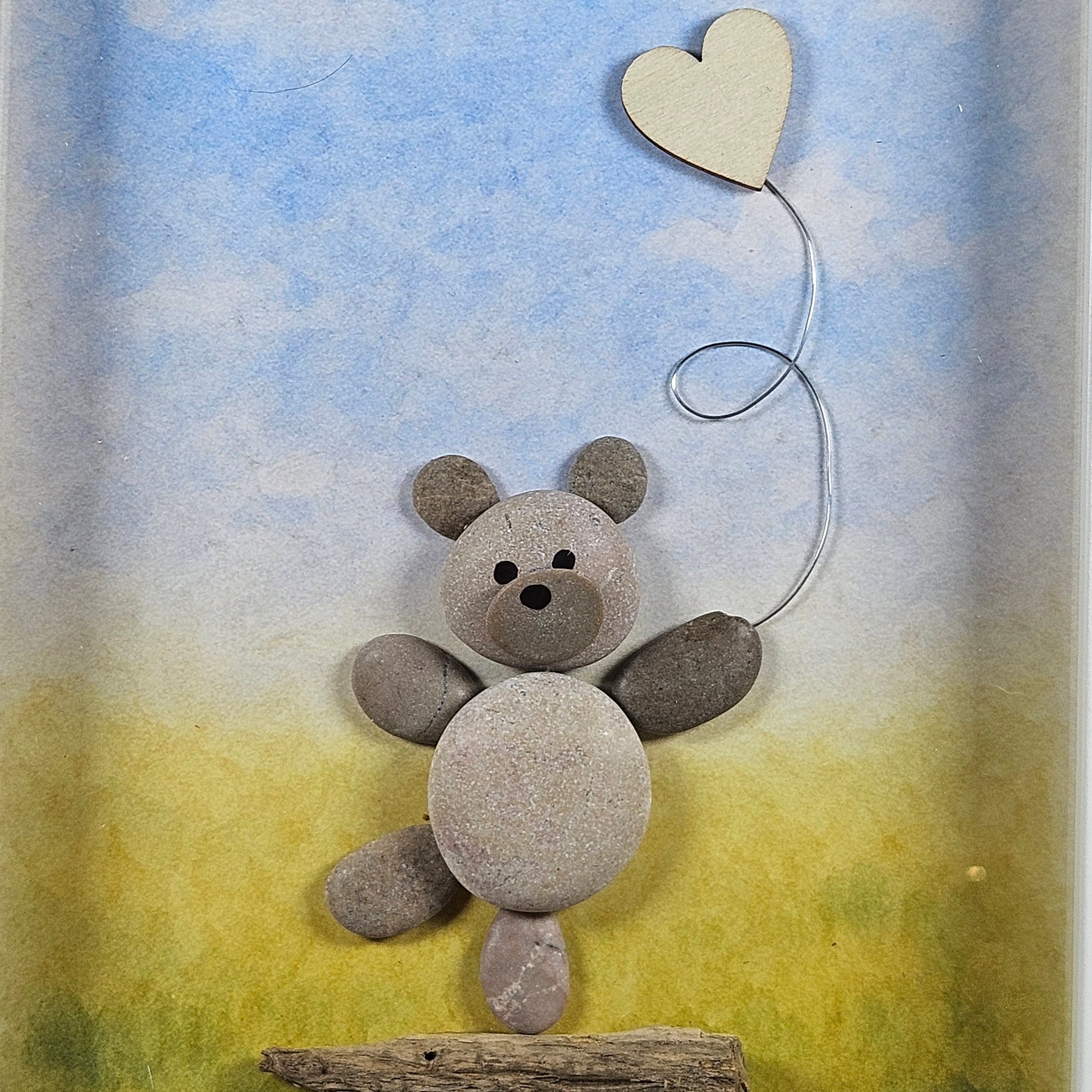 🐻 Un adorable ourson en galets tient un ballon en forme de cœur qui s’élève doucement dans le ciel.