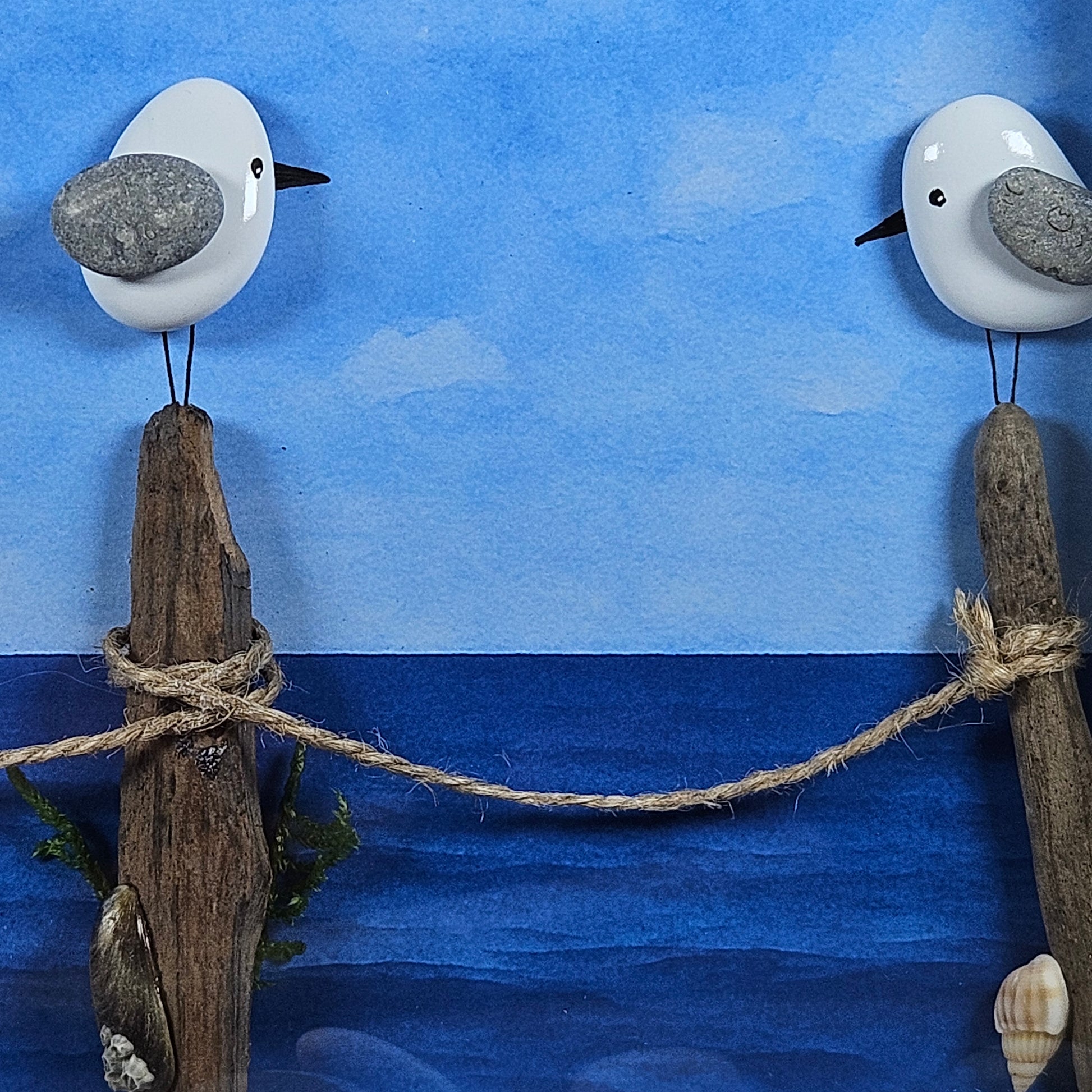 🌊 Une rangée de petits oiseaux en galets est perchée sur les poteaux d’un ponton de bois, reliés par de fines cordes.