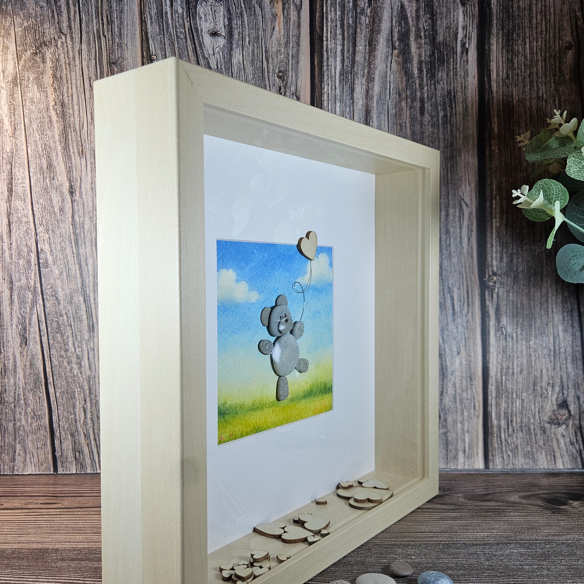Dans ce cadre vitrine profond, un petit ourson en galets s’élève vers le ciel, tenant un ballon en forme de cœur 🎈. À l’arrière-plan, des cœurs en bois décoratifs donnent de la profondeur à la scène, renforçant la douceur et la tendresse de cette création. Un tableau unique qui évoque l’amour, l’innocence et la joie enfantine. Le fond est imprimé sur un papier qualitatif de 180g.