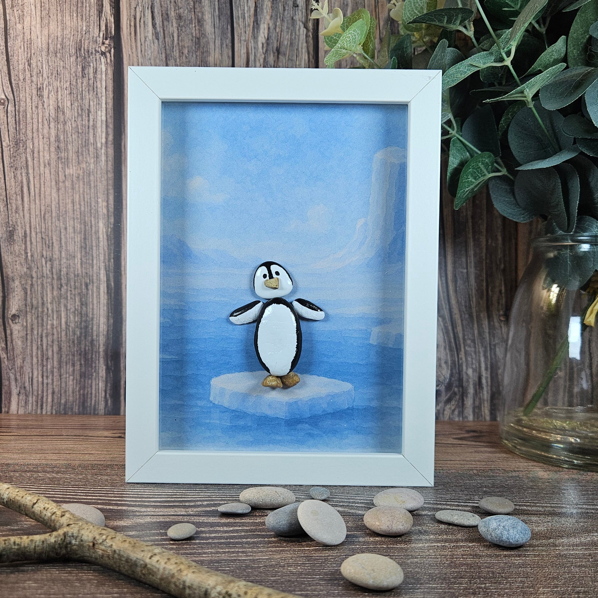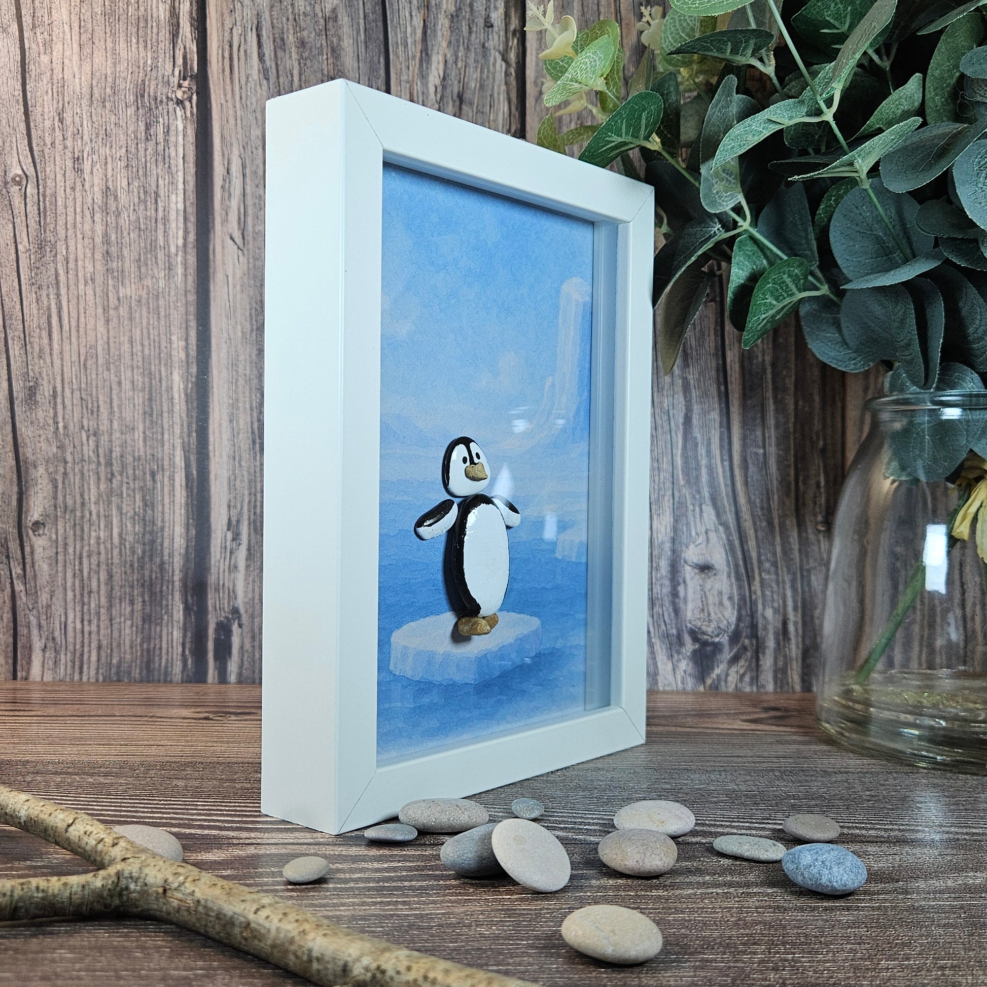 🐧 Un mignon pingouin en galets se tient fièrement sur la glace, dans un décor doux aux reflets bleutés.