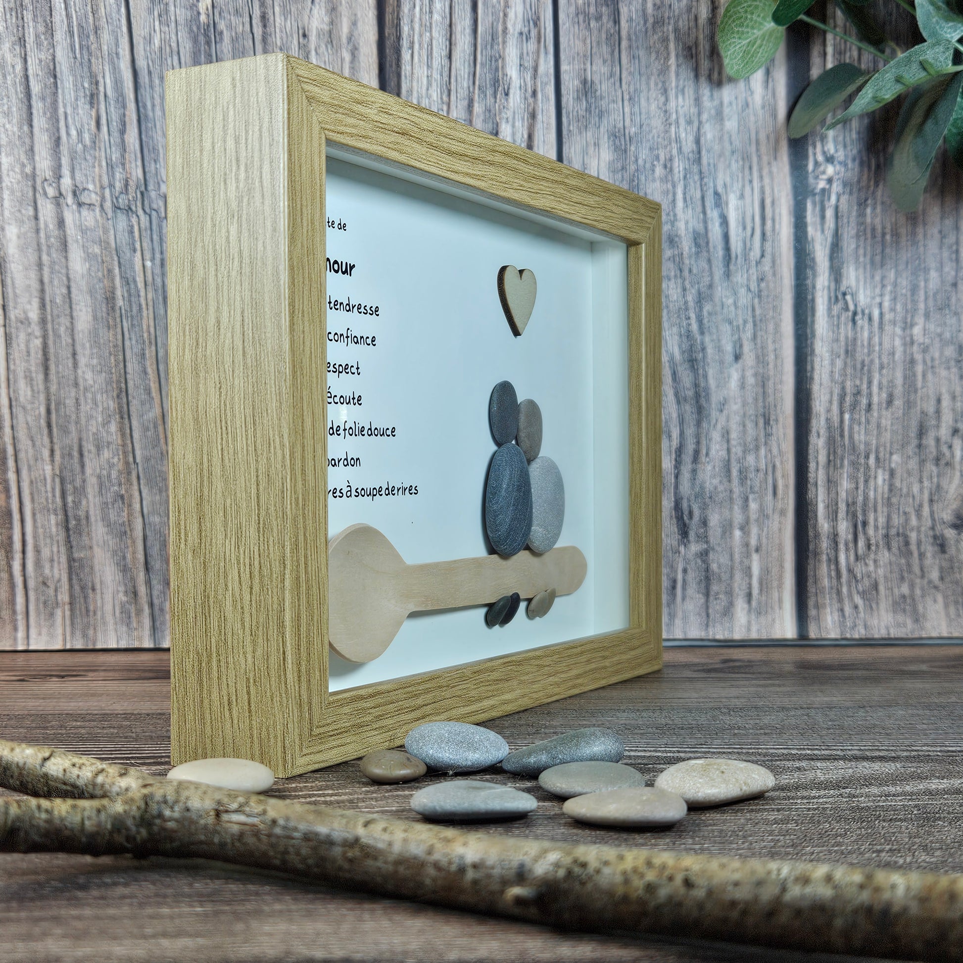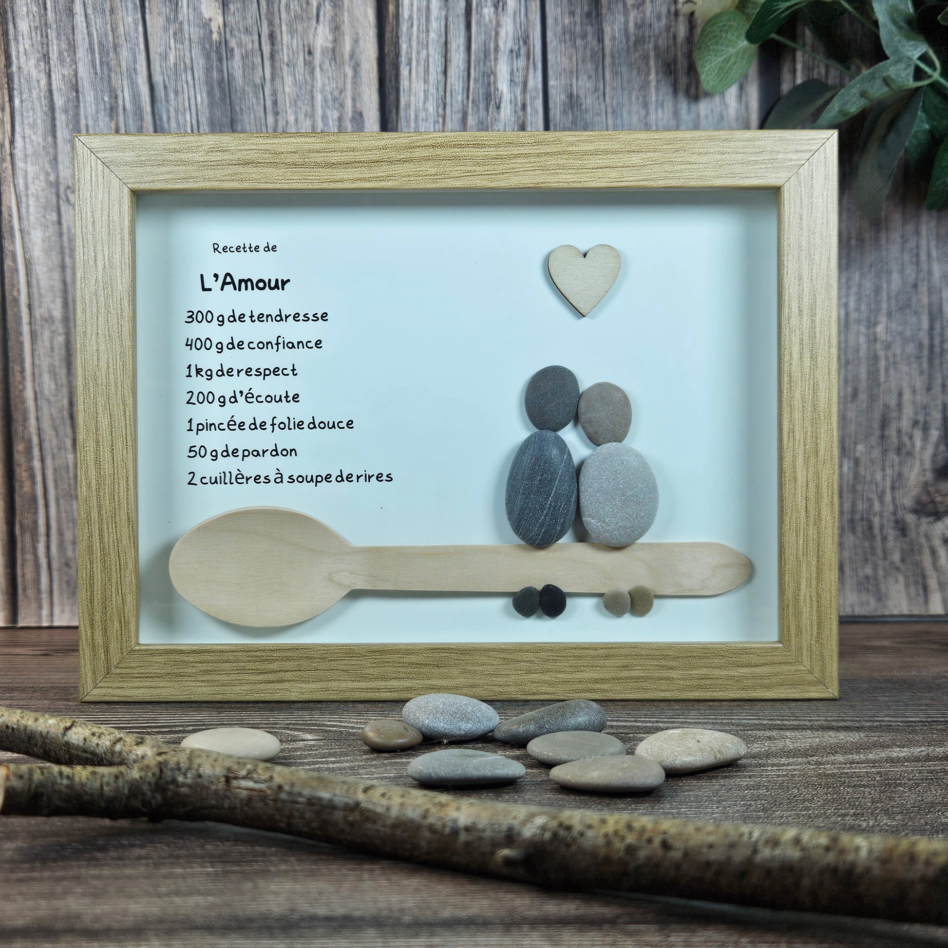 ❤️ Deux petits galets s’enlacent tendrement sous un cœur en bois, tandis qu’une cuillère symbolique attend de mélanger les ingrédients… ceux de l’amour 💕