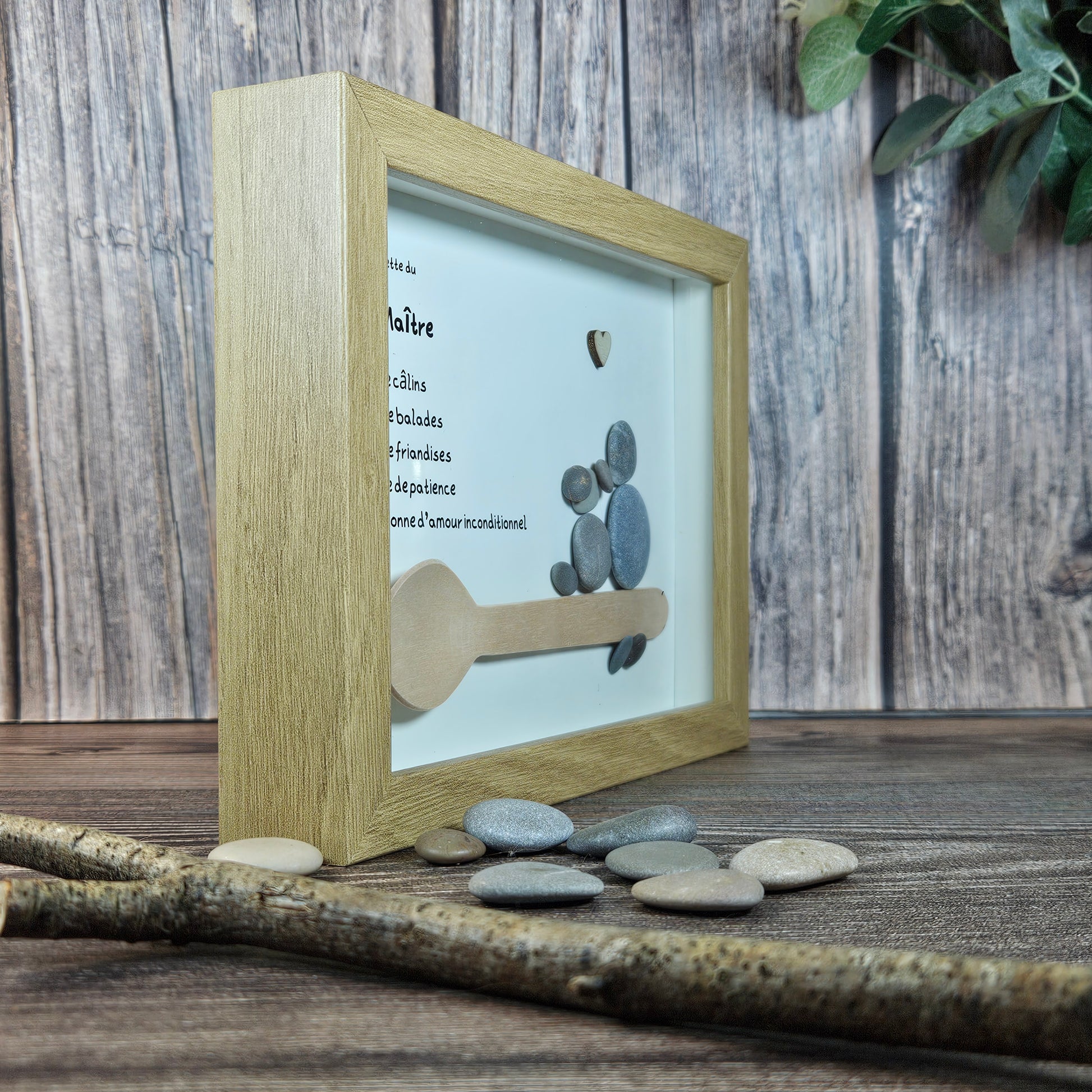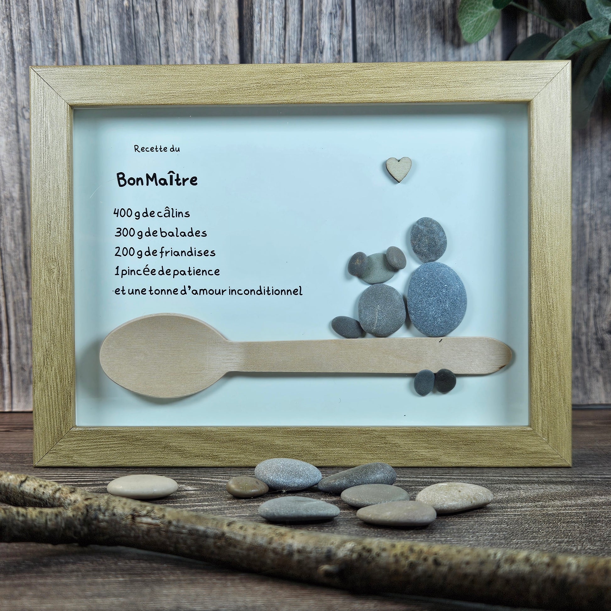 🐾 Un petit personnage en galets accompagné de son fidèle compagnon… symbole du maître attentionné, joueur, protecteur et plein d’amour. À côté d’eux, une cuillère en bois attend de mélanger les meilleurs ingrédients : promenades partagées, gratouilles, patience, tendresse et complicité infinie 🤍
