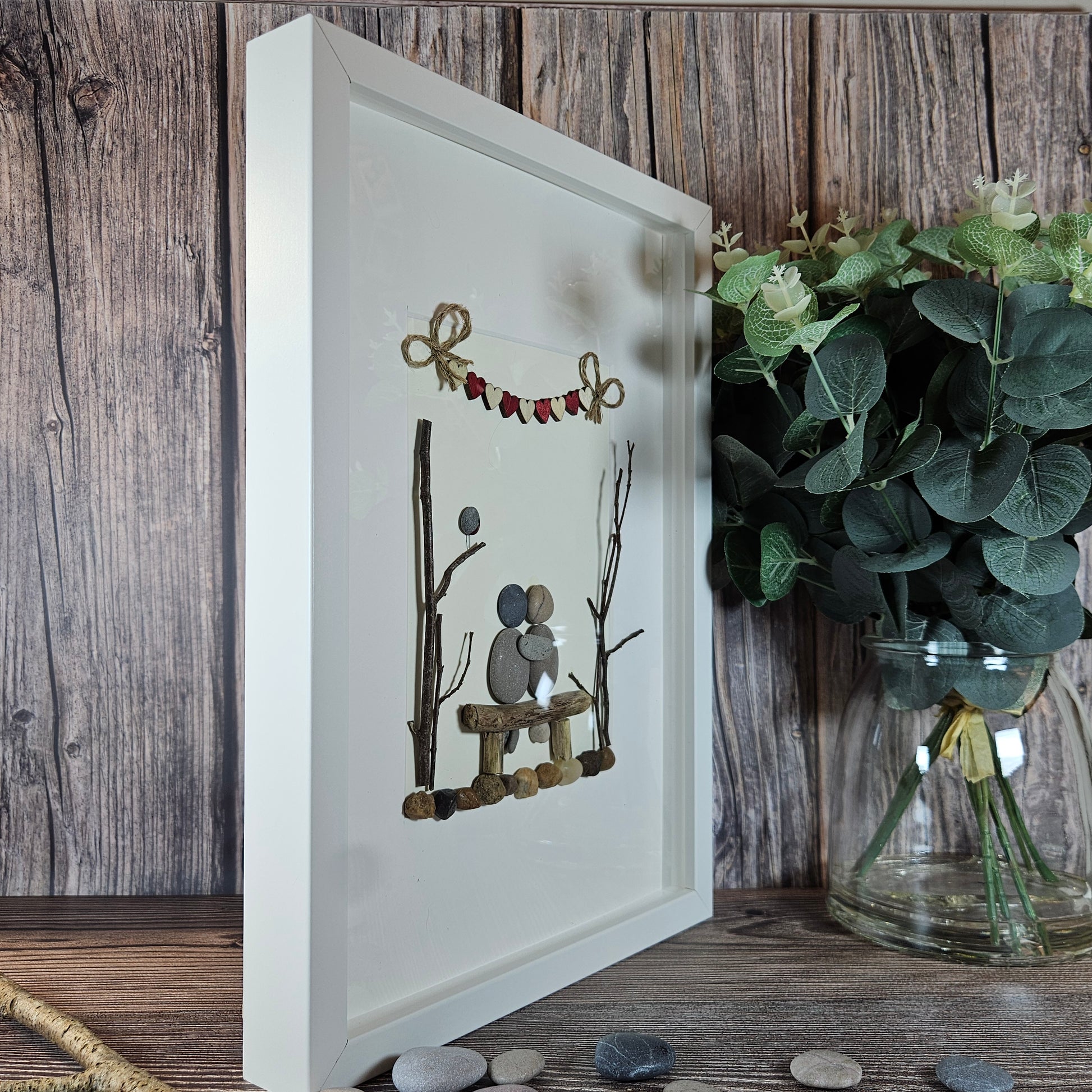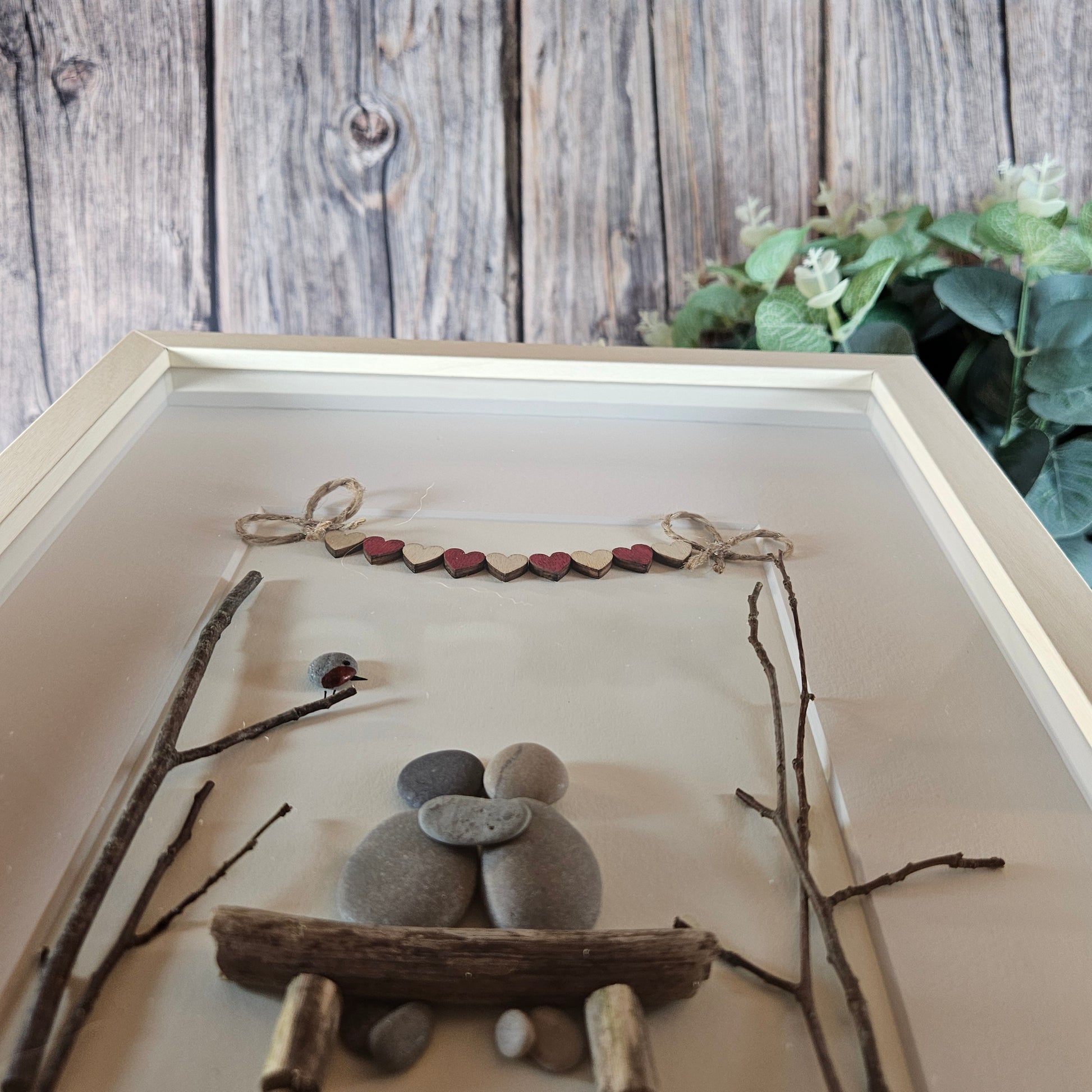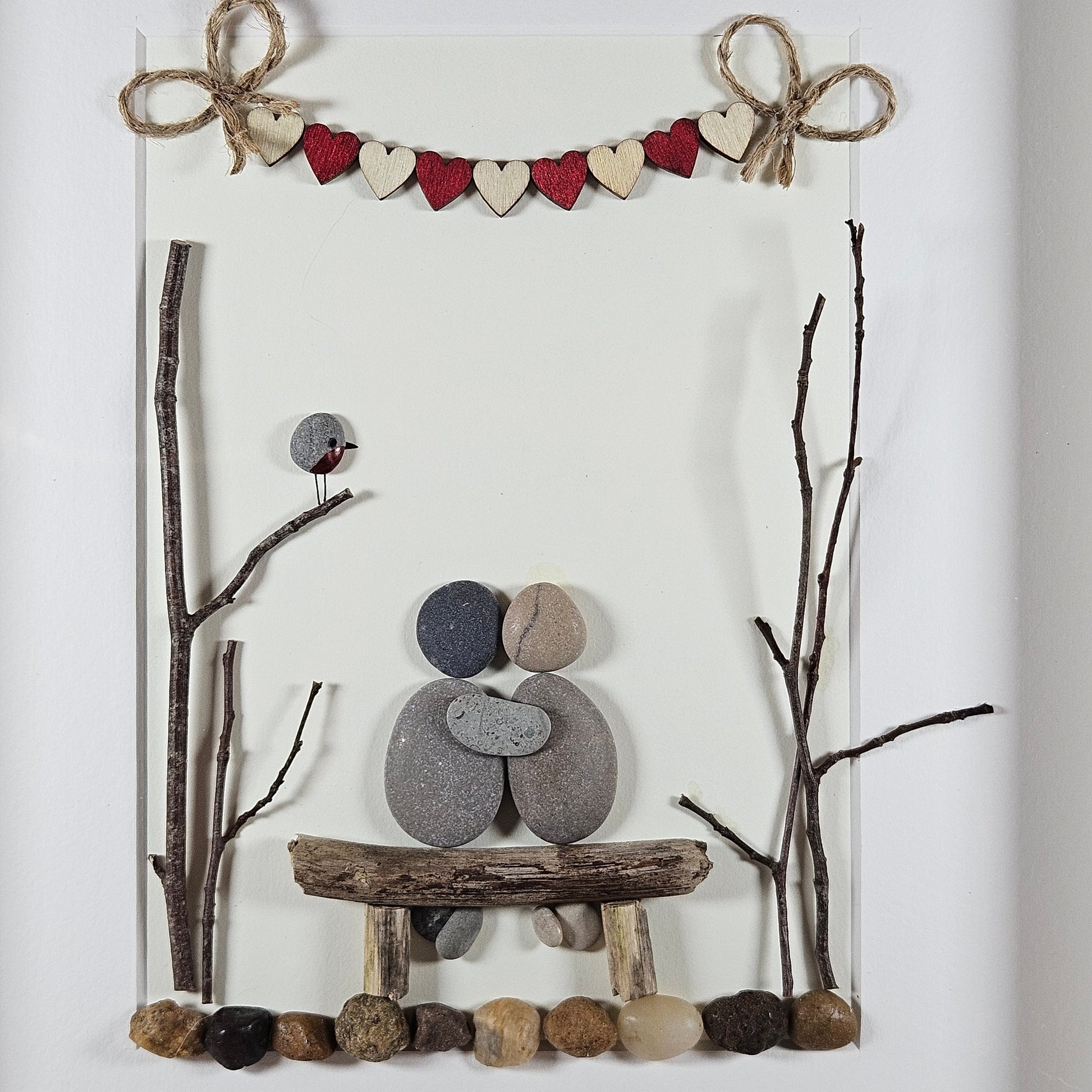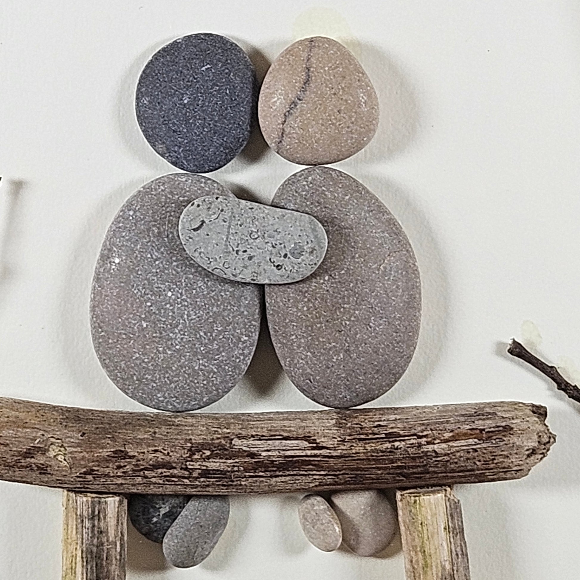 🪨 Deux galets tendrement enlacés, assis sur un banc en bois flotté, entourés de branches fines et sobres…