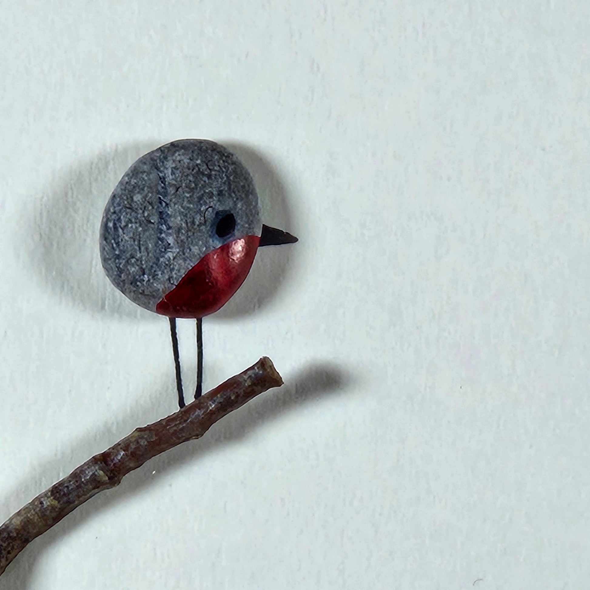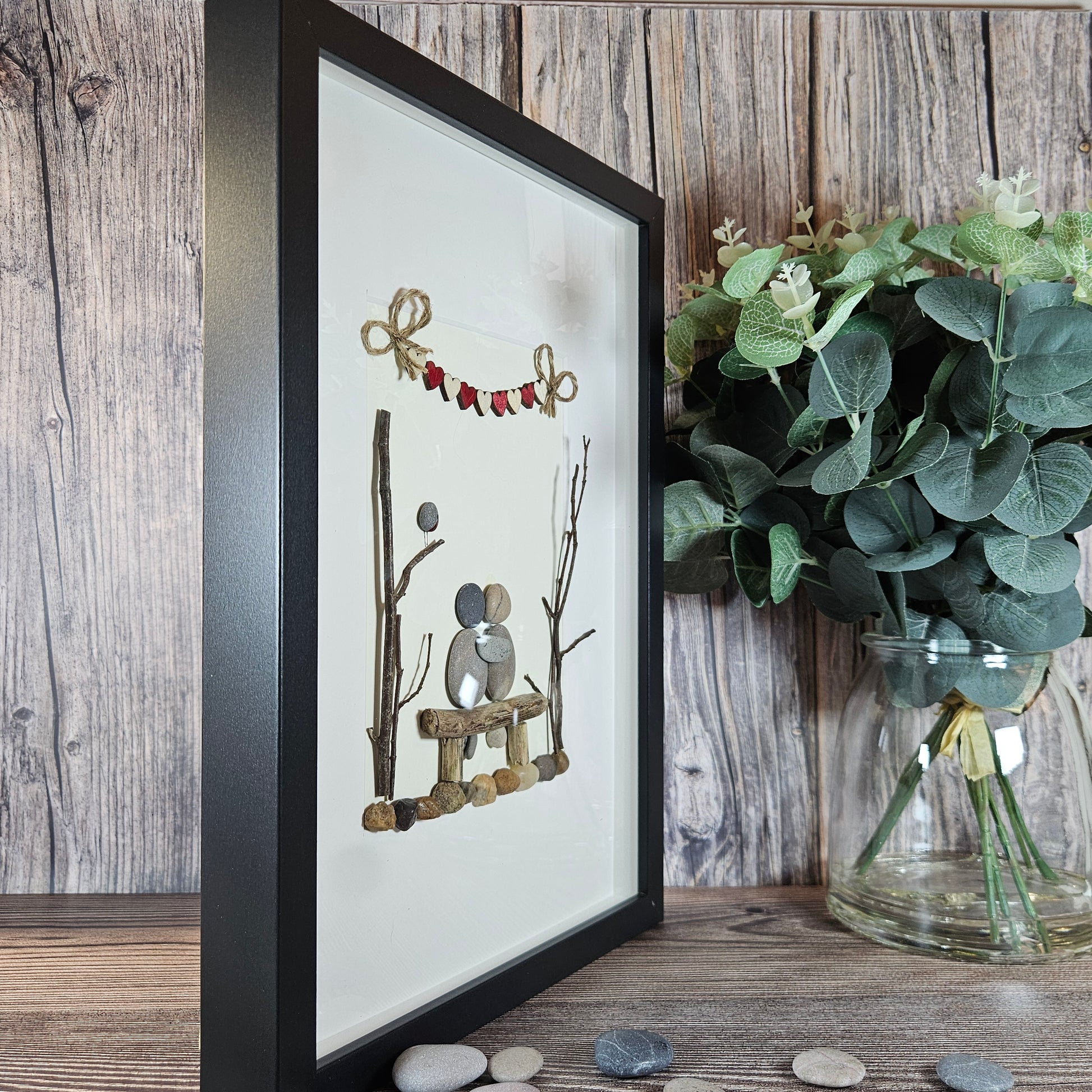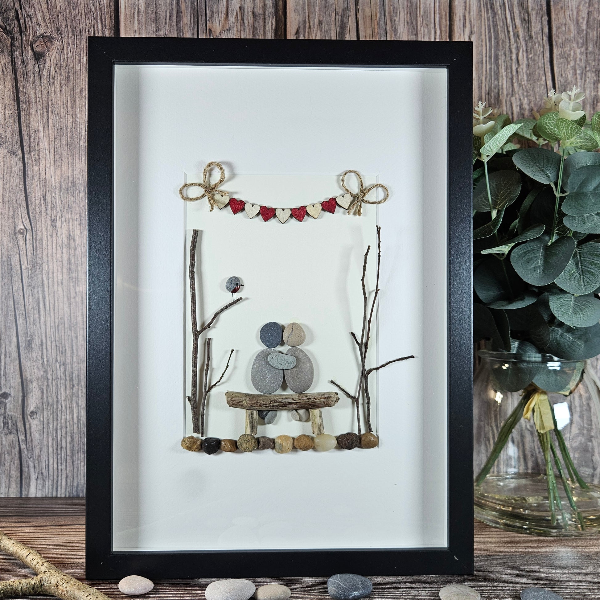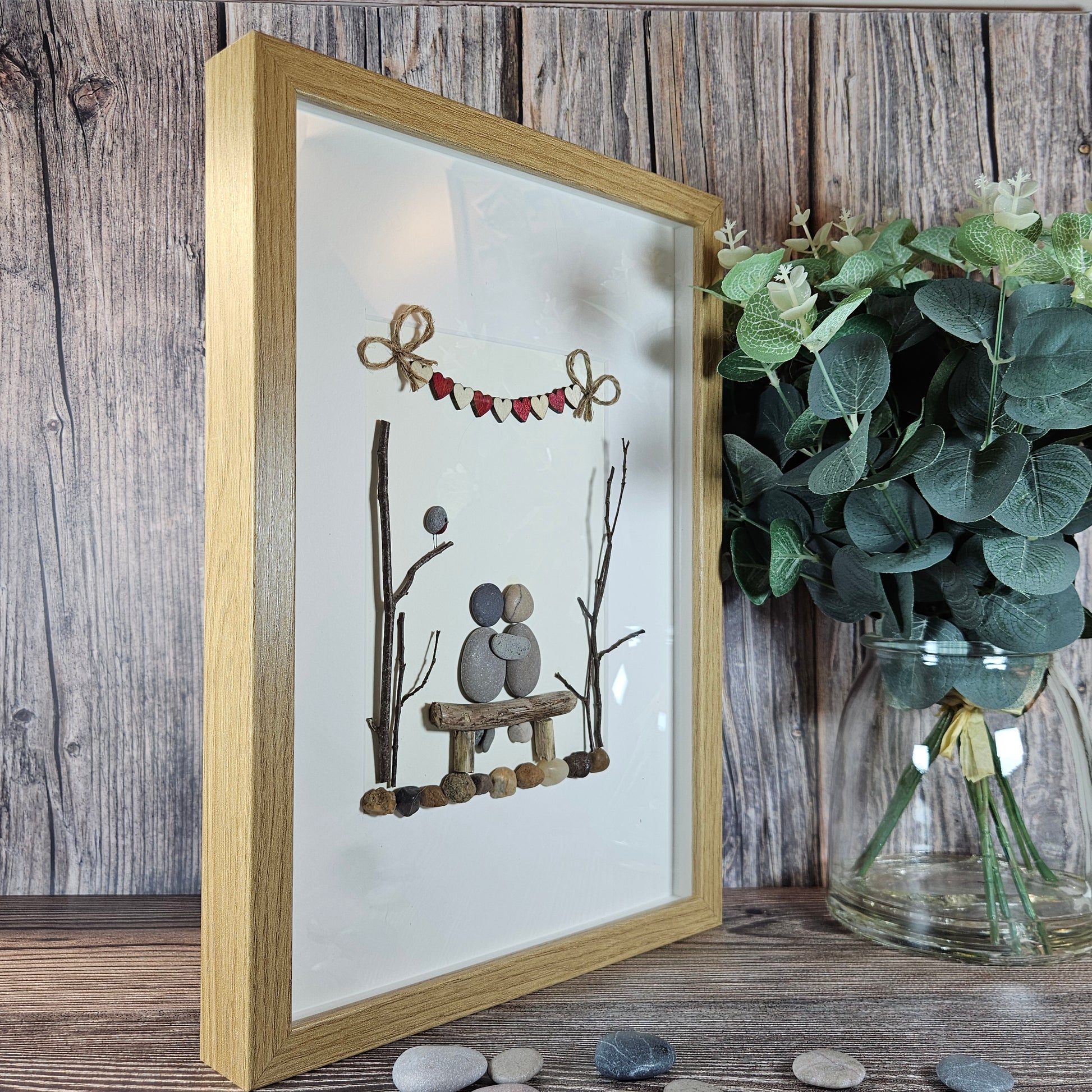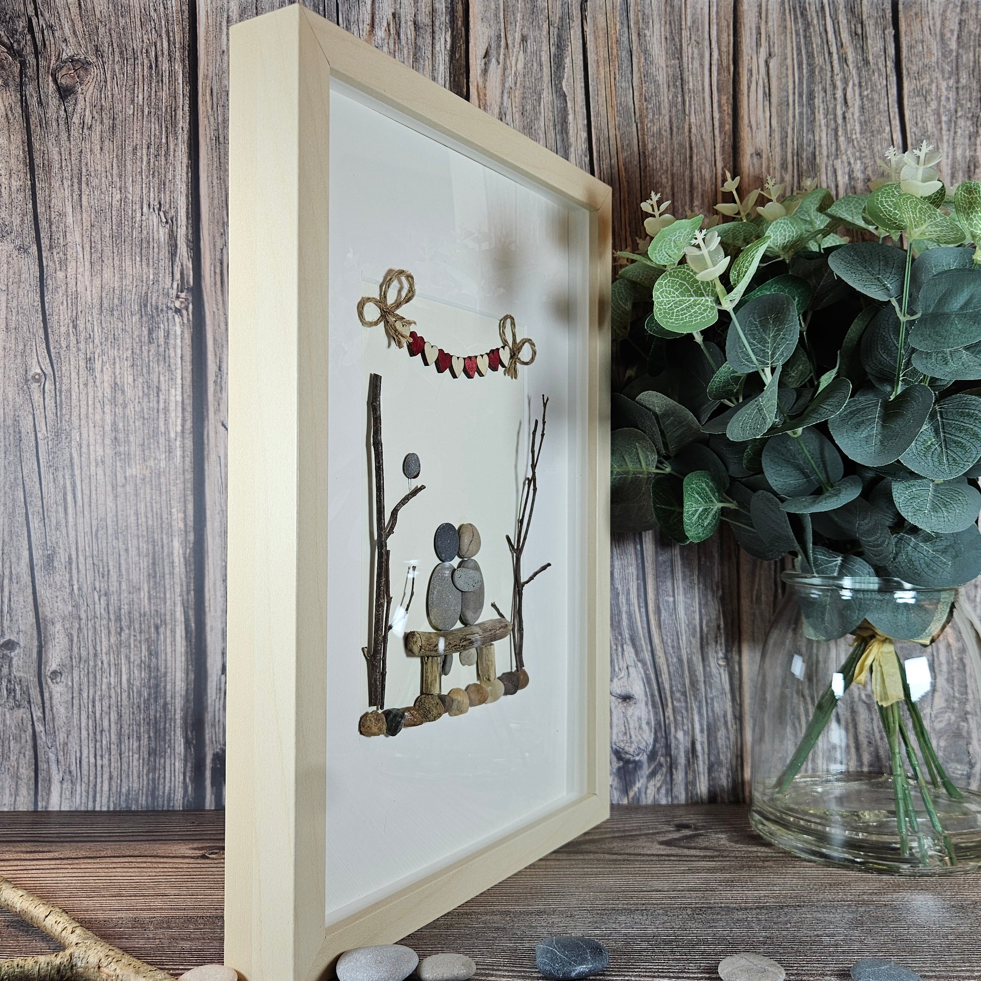 🪨 Deux galets tendrement enlacés, assis sur un banc en bois flotté, entourés de branches fines et sobres…