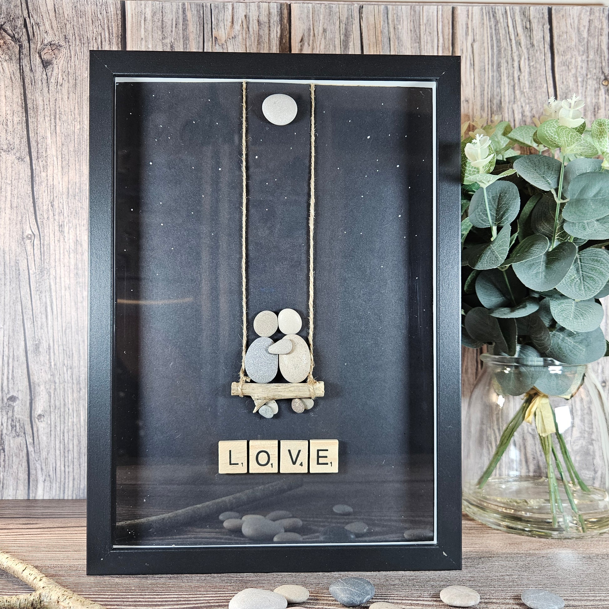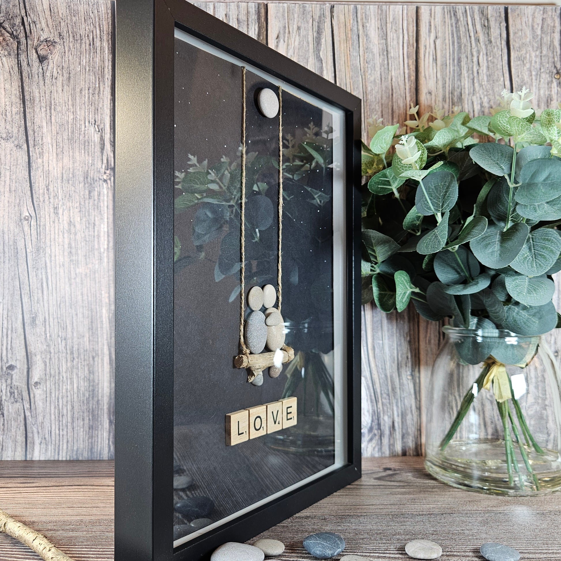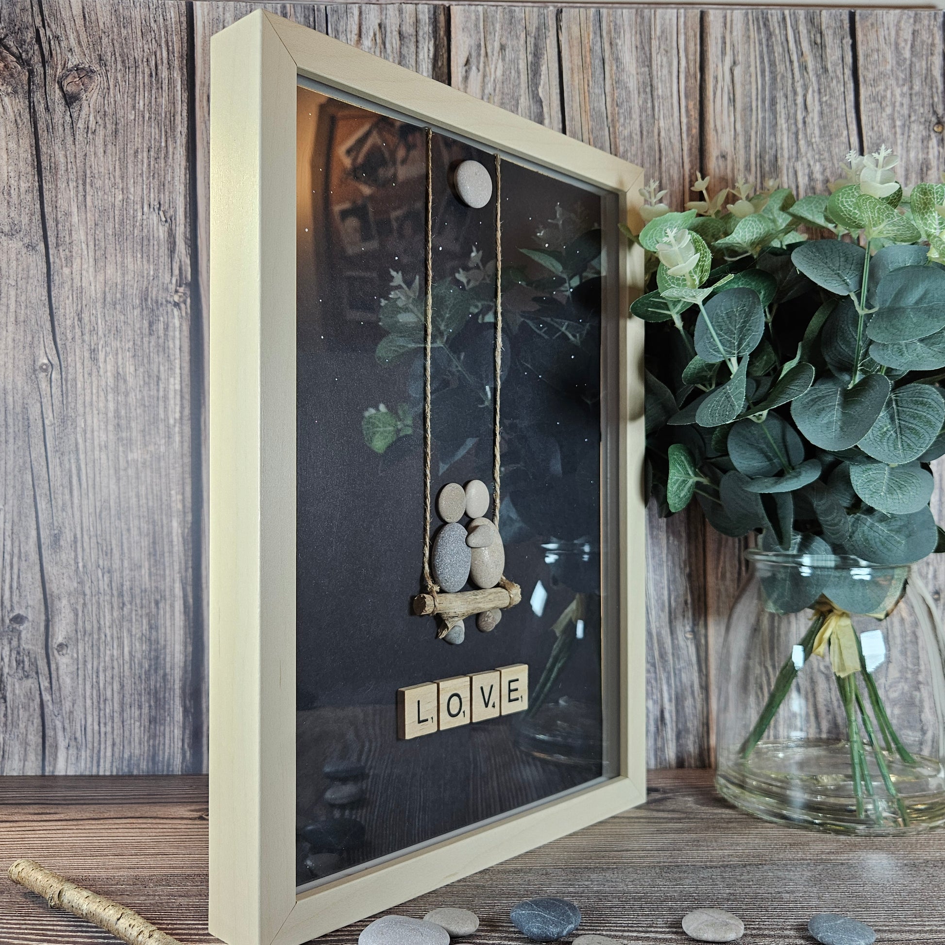 🔍 Ce tableau galets LOVE avec couple sur balançoire sous la lune est une idée de cadeau fait main, idéale pour un couple, un anniversaire ou une décoration romantique.