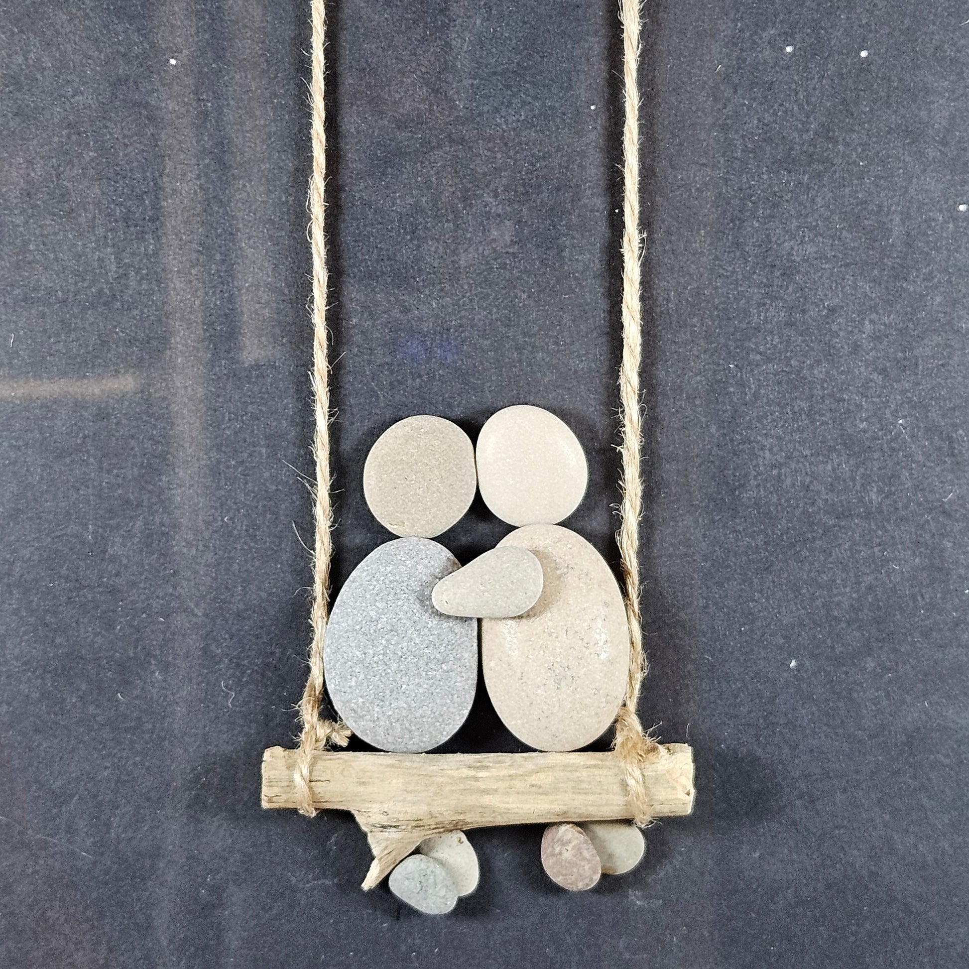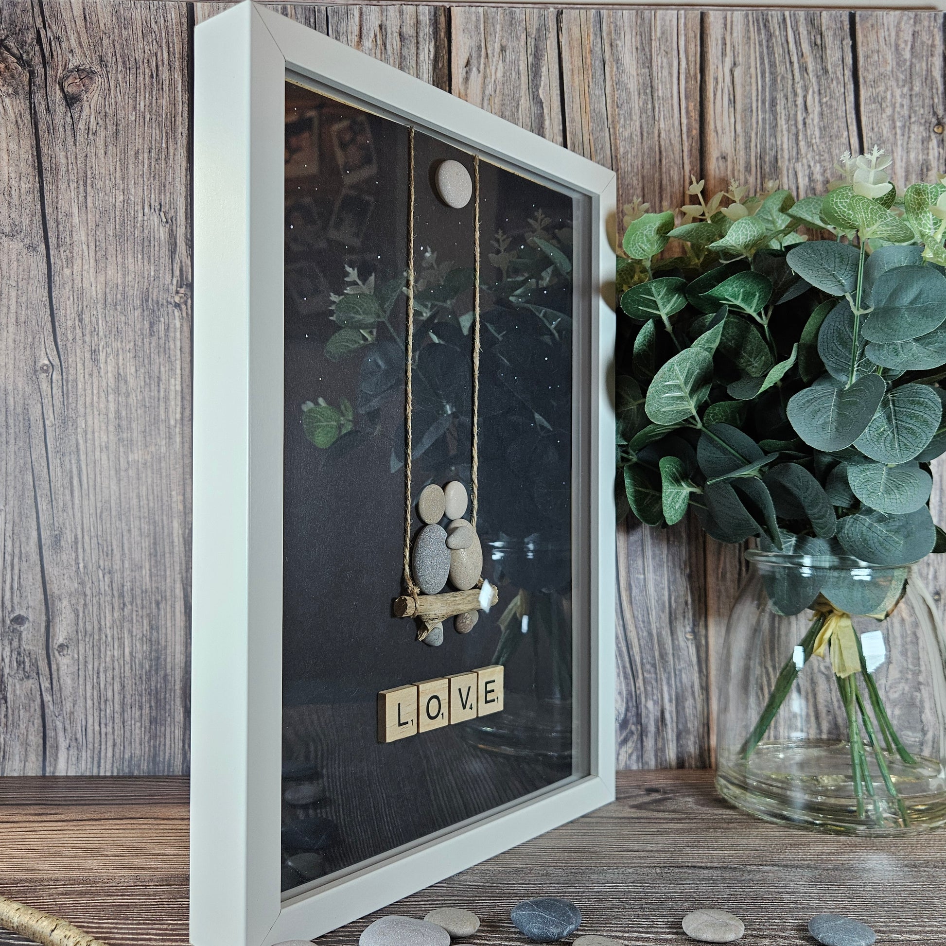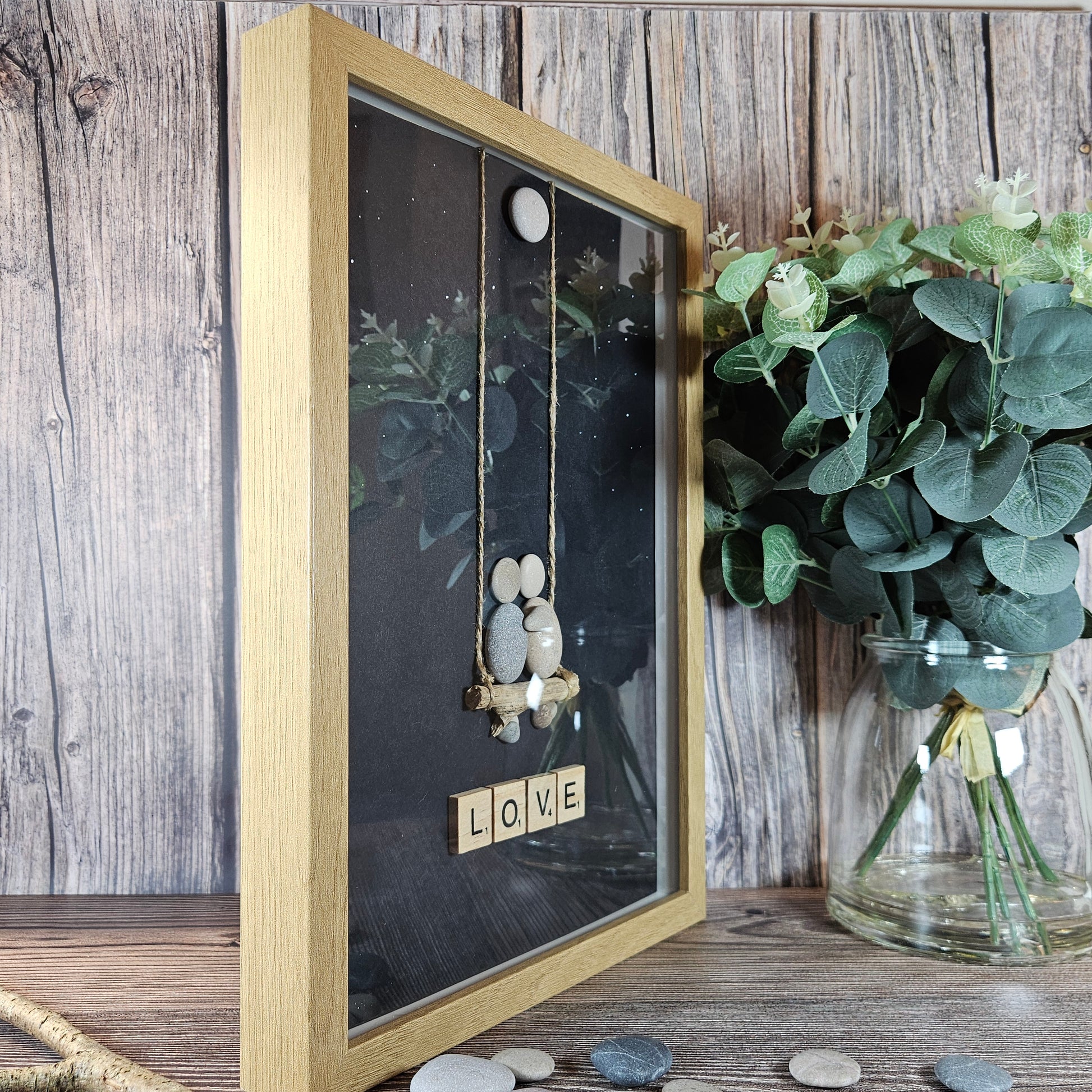 🔍 Ce tableau galets LOVE avec couple sur balançoire sous la lune est une idée de cadeau fait main, idéale pour un couple, un anniversaire ou une décoration romantique.