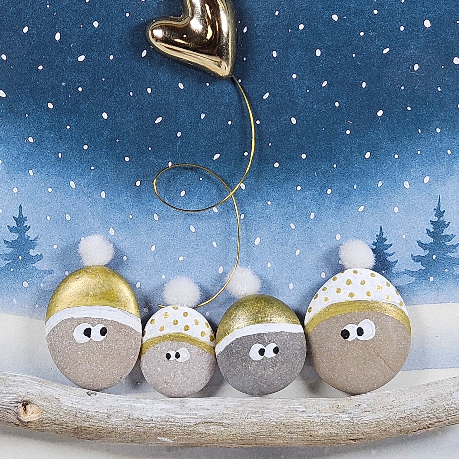 Sous un ciel étoilé, quatre petits galets se blottissent tendrement sur une branche de bois,