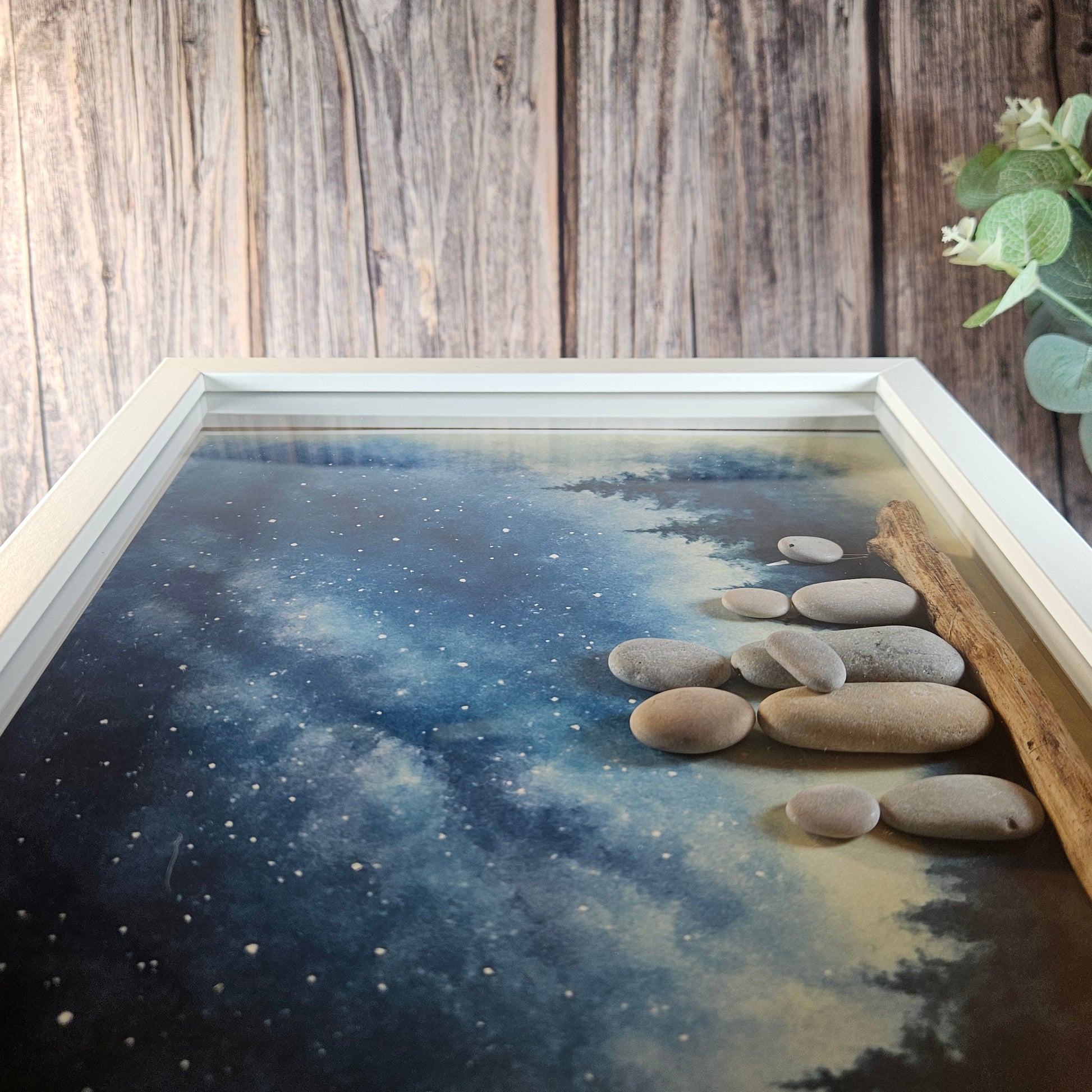 🌌 Sous un ciel constellé de mille étoiles, une famille de galets se réunit sur un tronc boisé.