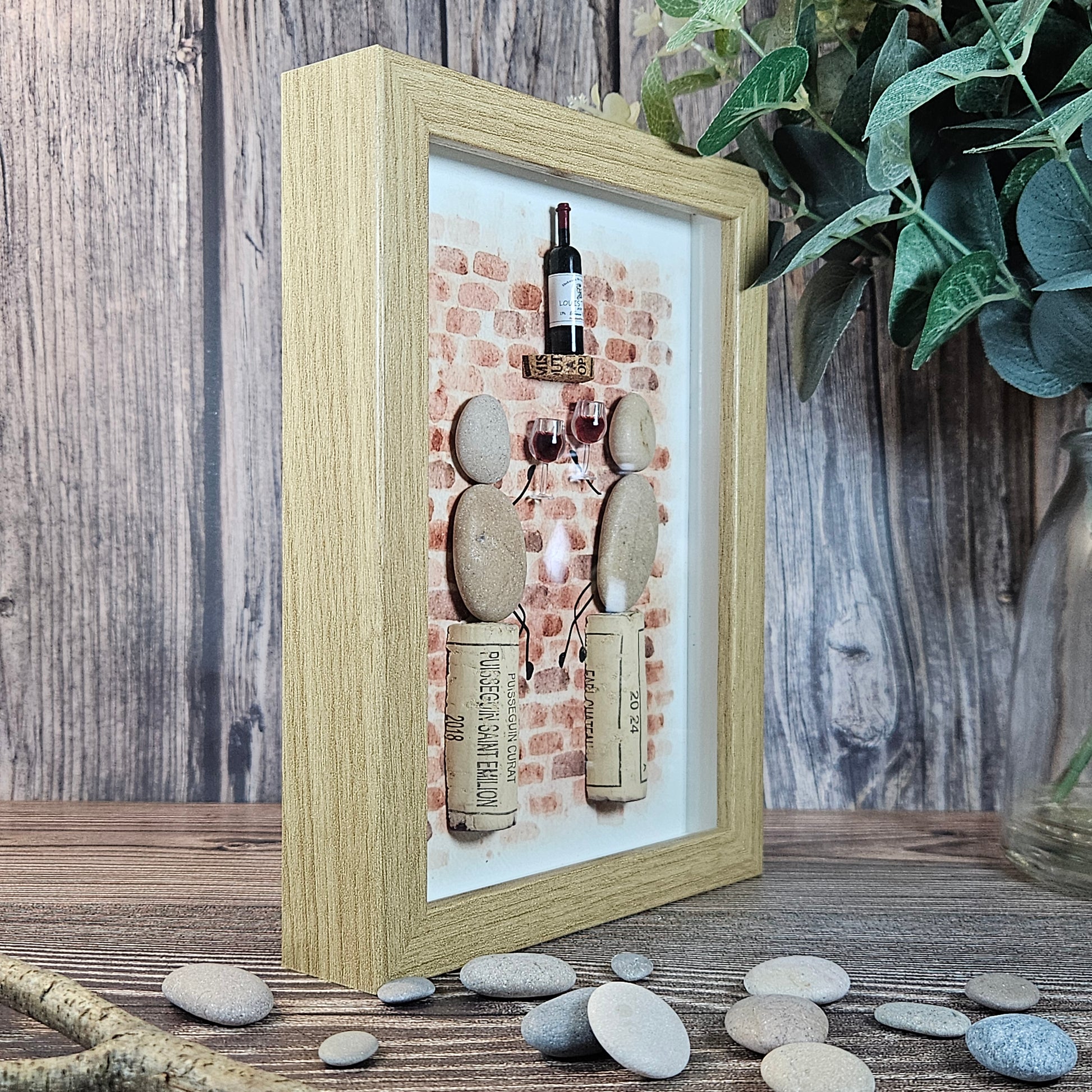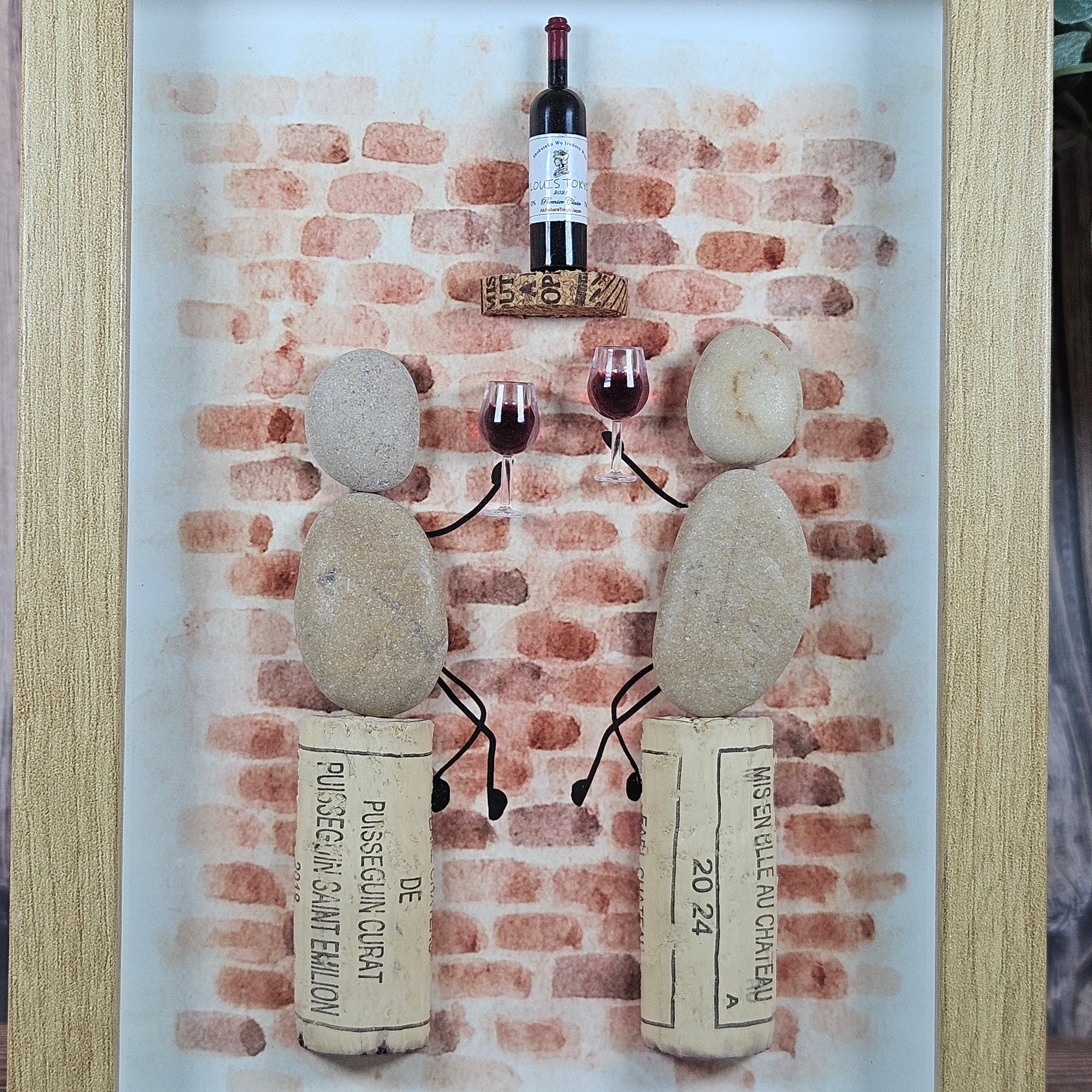 🍇 Deux personnages en galets trinquent joyeusement devant une cave aux briques rouges, verres de vin à la main.